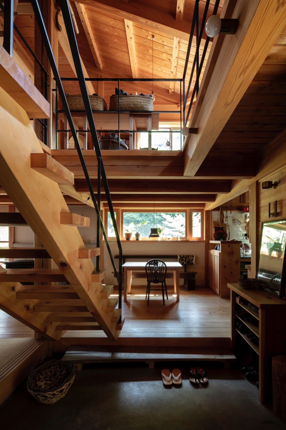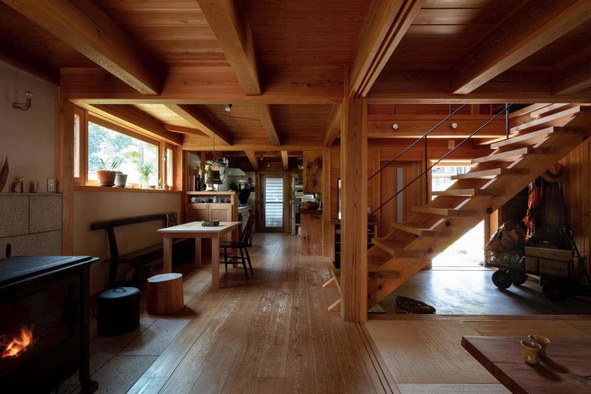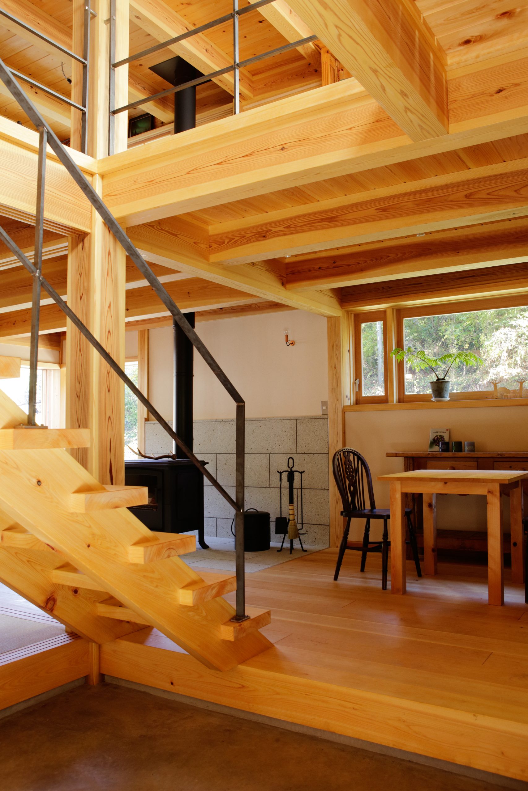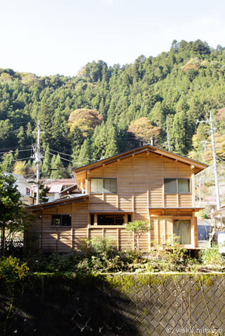 東京都檜原村、秋川沿いの土地にて、林業を営む夫婦の新居。施主が所有する森の杉ヒノキサワラを材料に、製材、天然乾燥、村内の棟梁が手刻みした木組みの家。限られた日照、河川沿いの高湿度、冬の寒さに配慮して温熱及び調湿環境を整えている。