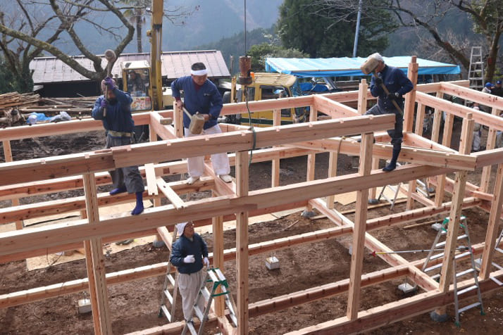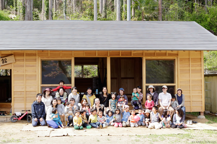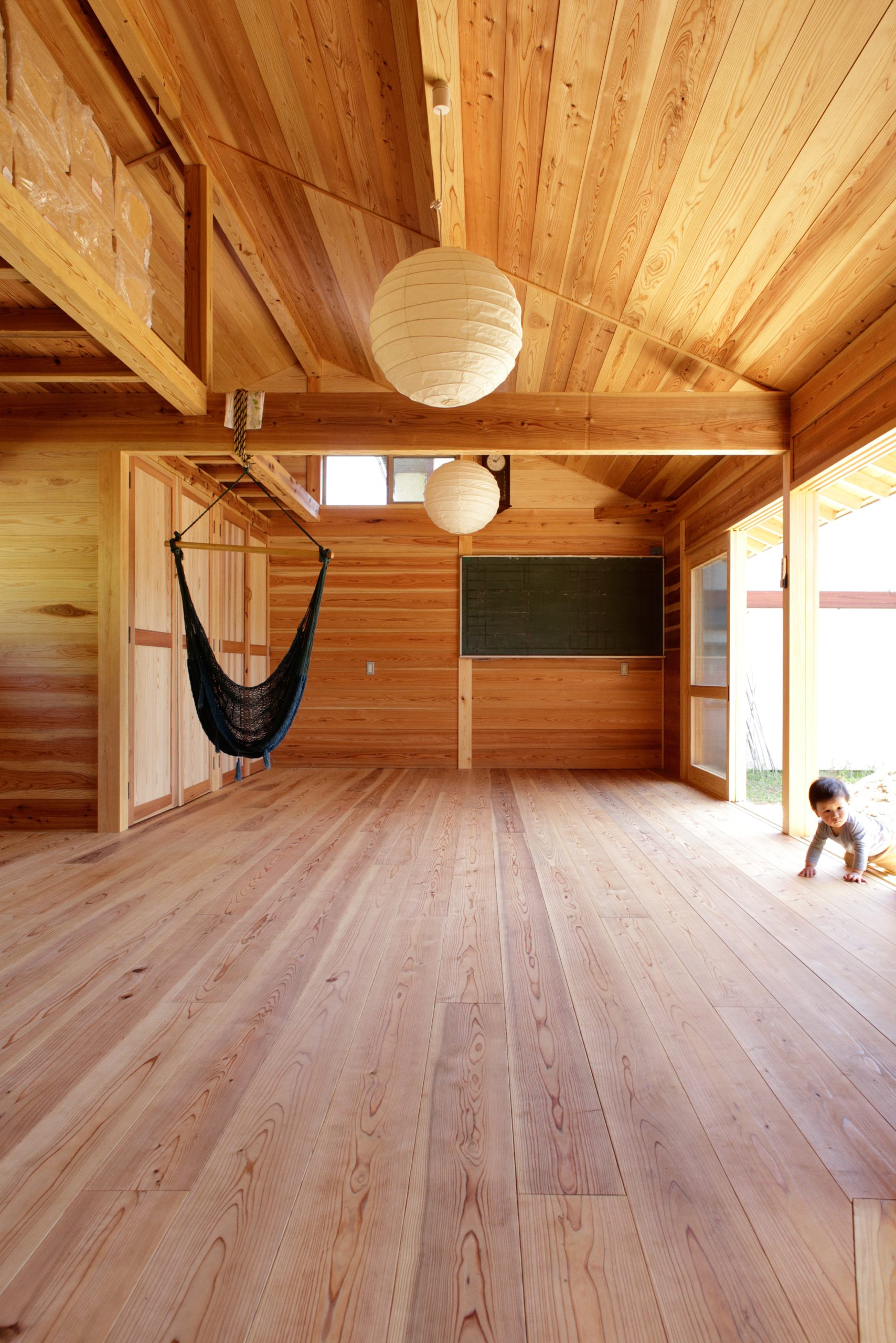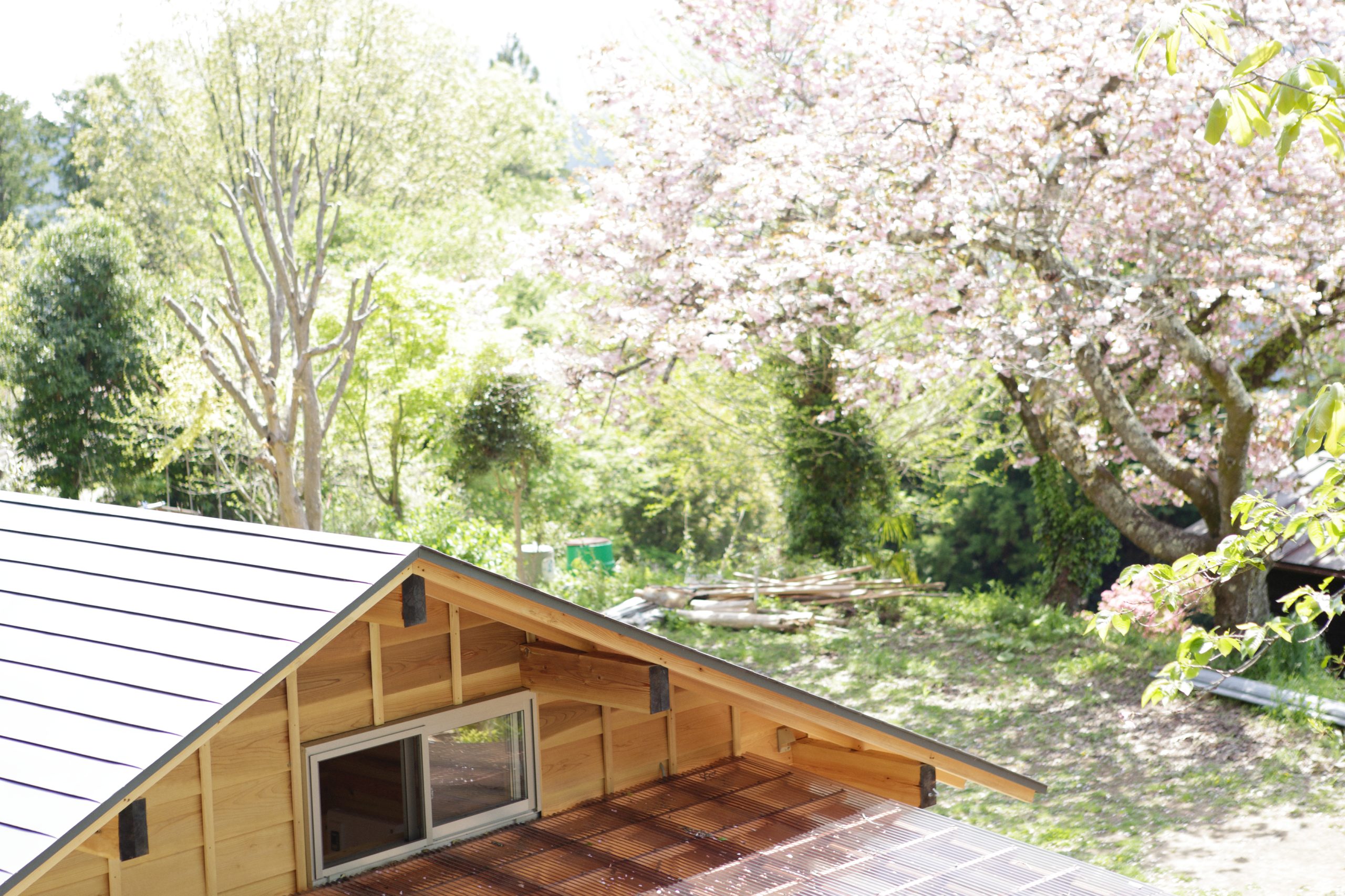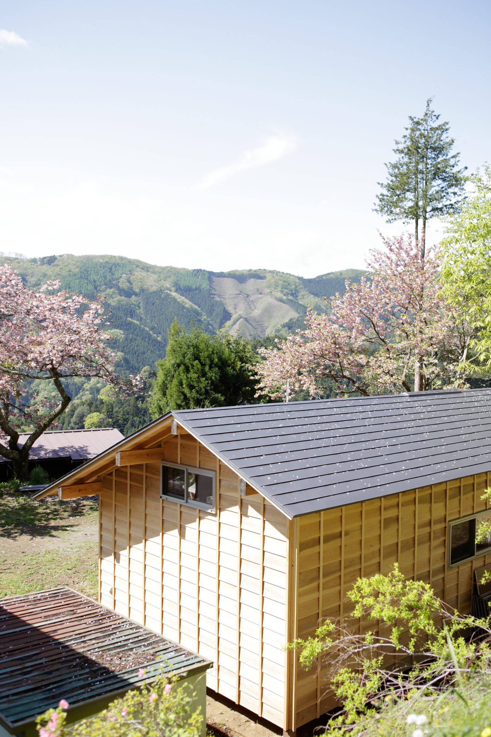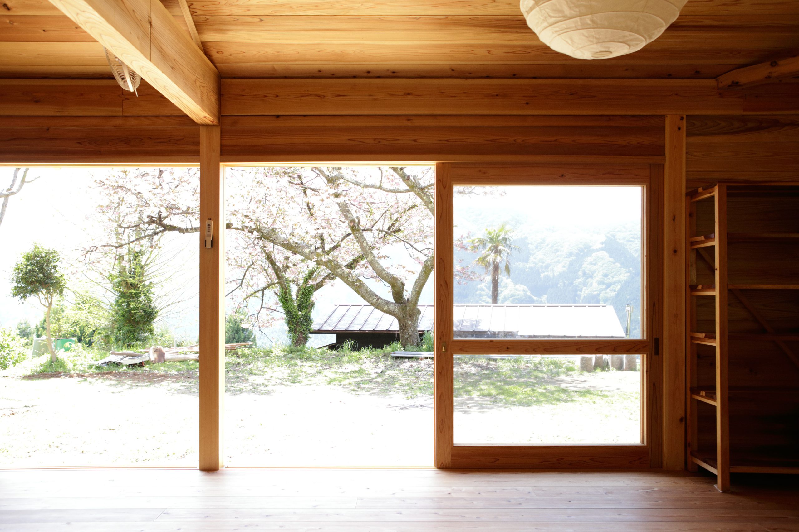 会合やお祭りごと、防災機能を備えるために、板間とキッチンと縁側とトイレ、大きな軒下をシンプルに配置している。薪の五右衛門風呂も製作。独立基礎高床式で土中の通気浸透環境を確保しながら、構造材と内外装を村内の杉とサワラで仕上げている。木質の調湿断熱材も併せて、あらゆる工事を集落住民の方々と建設した。