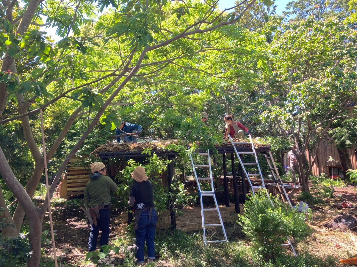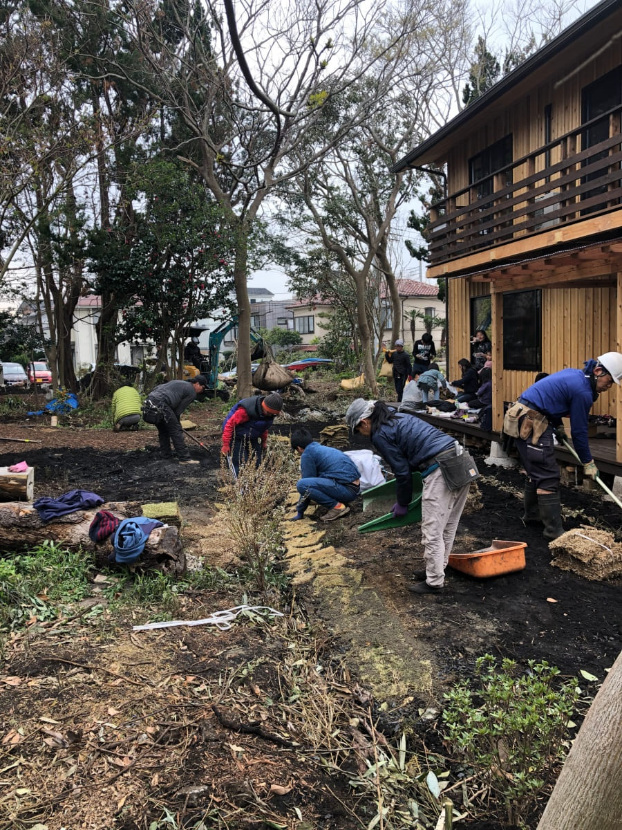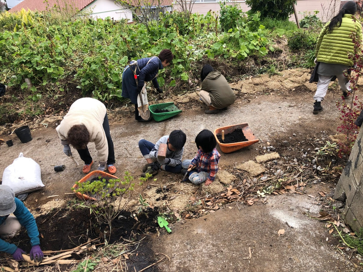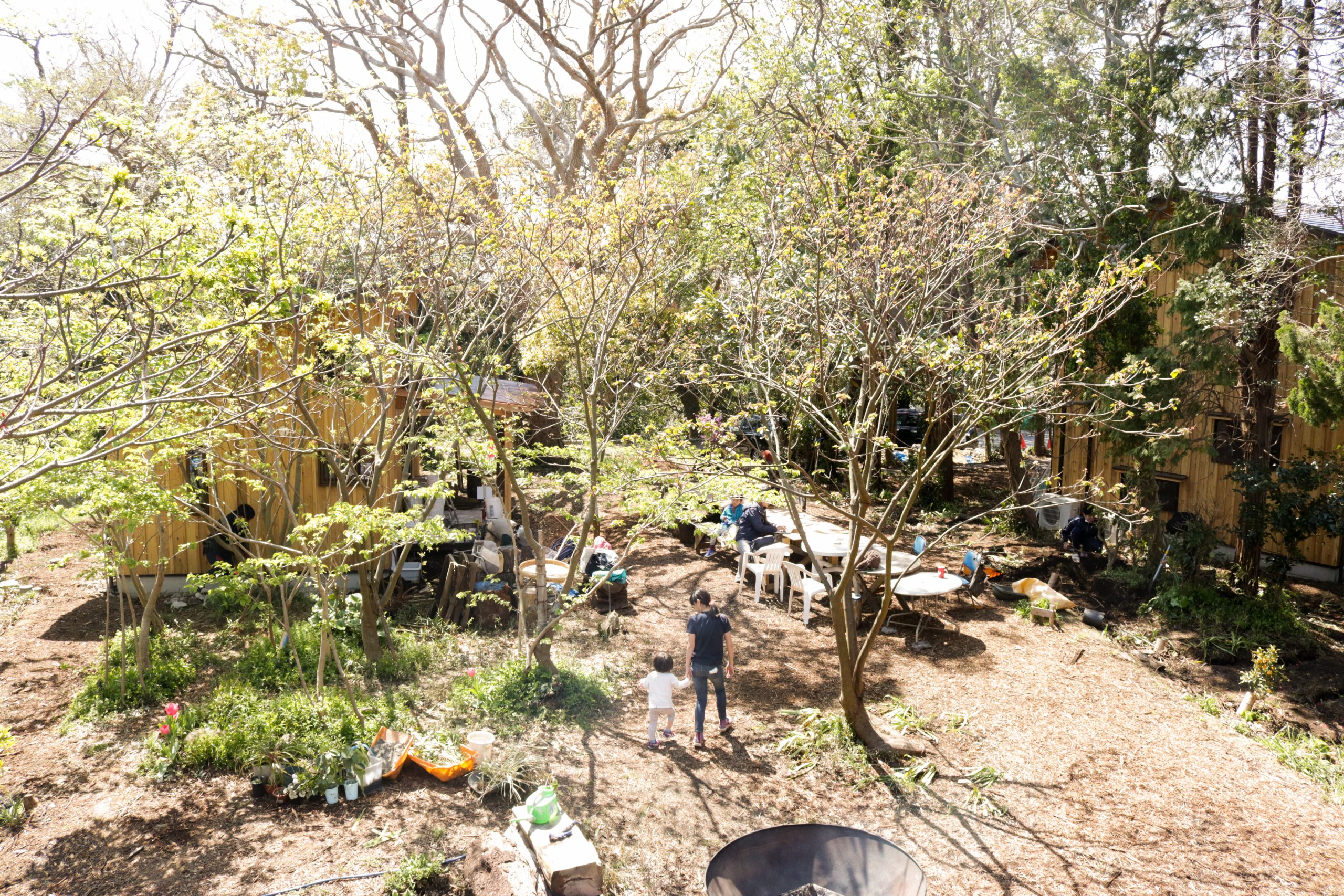 湘南秋谷の尾根、神社の上流に位置する土地にて、ファミリーホーム2棟と幼稚園の新築計画。既存の荒廃した家屋と樹木群を解体活用しながら、敷地内に加えて隣接した道と神社斜面地の環境再生の成果をヒントに、建物の分棟配置と土地利用を計画。建物はコンパクトかつシンプルな地杉の切妻屋根、内装はワークショップにより炭漆喰で仕上げた。現在は御神木のクスノキに見守られながら、施主と子ども達とともにメンテナンスを継続して育んでいる。
