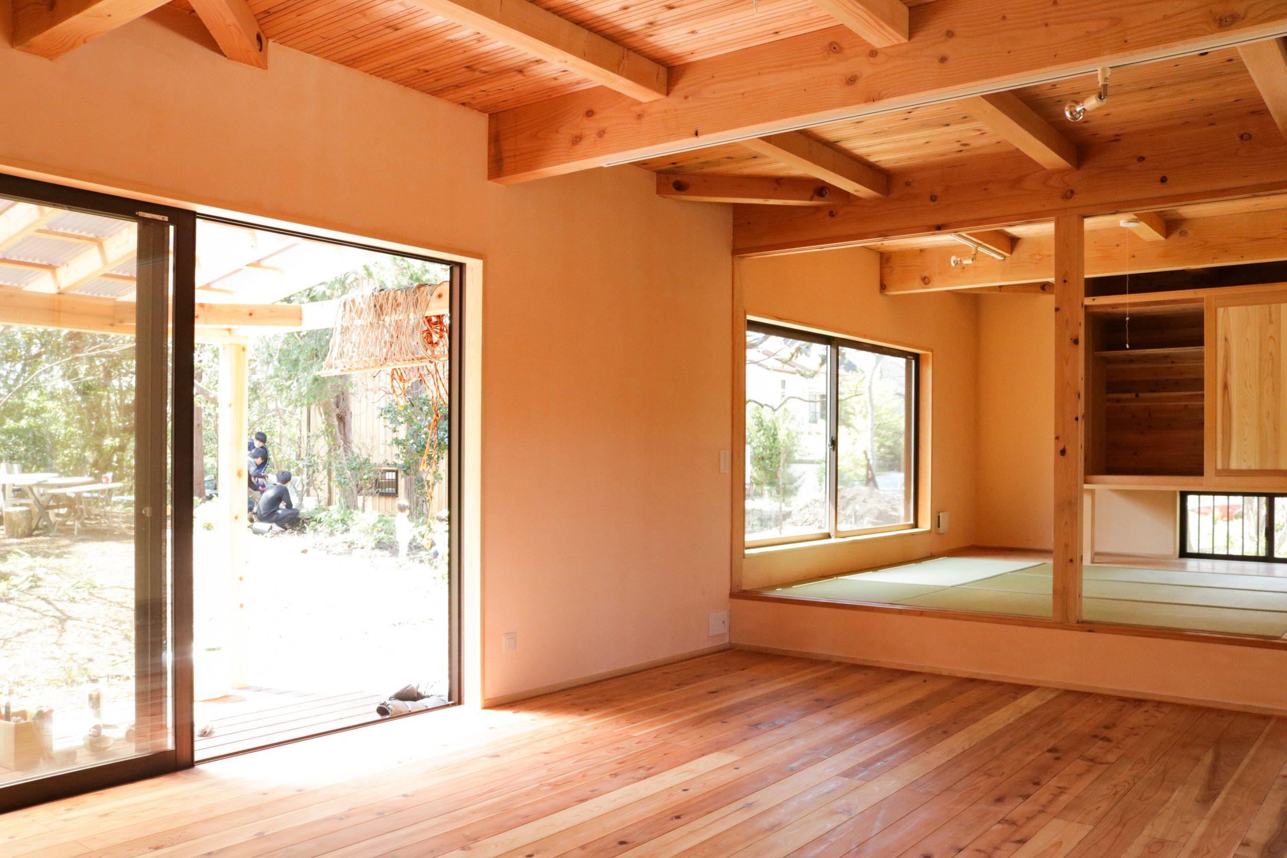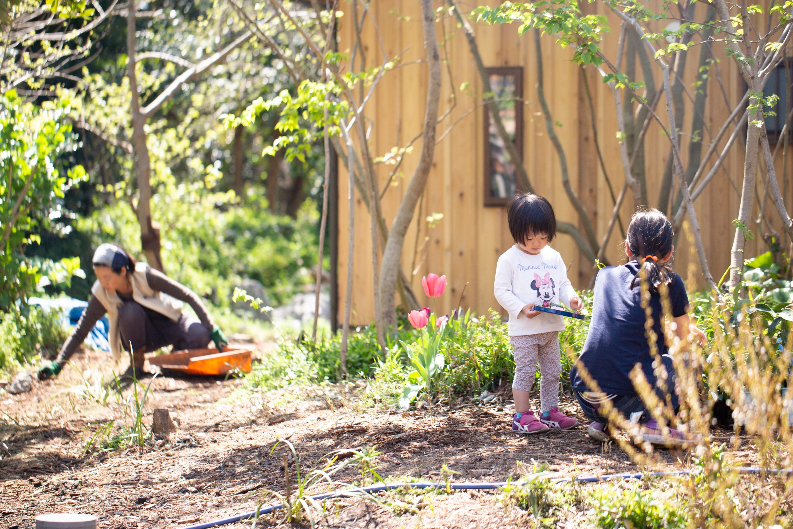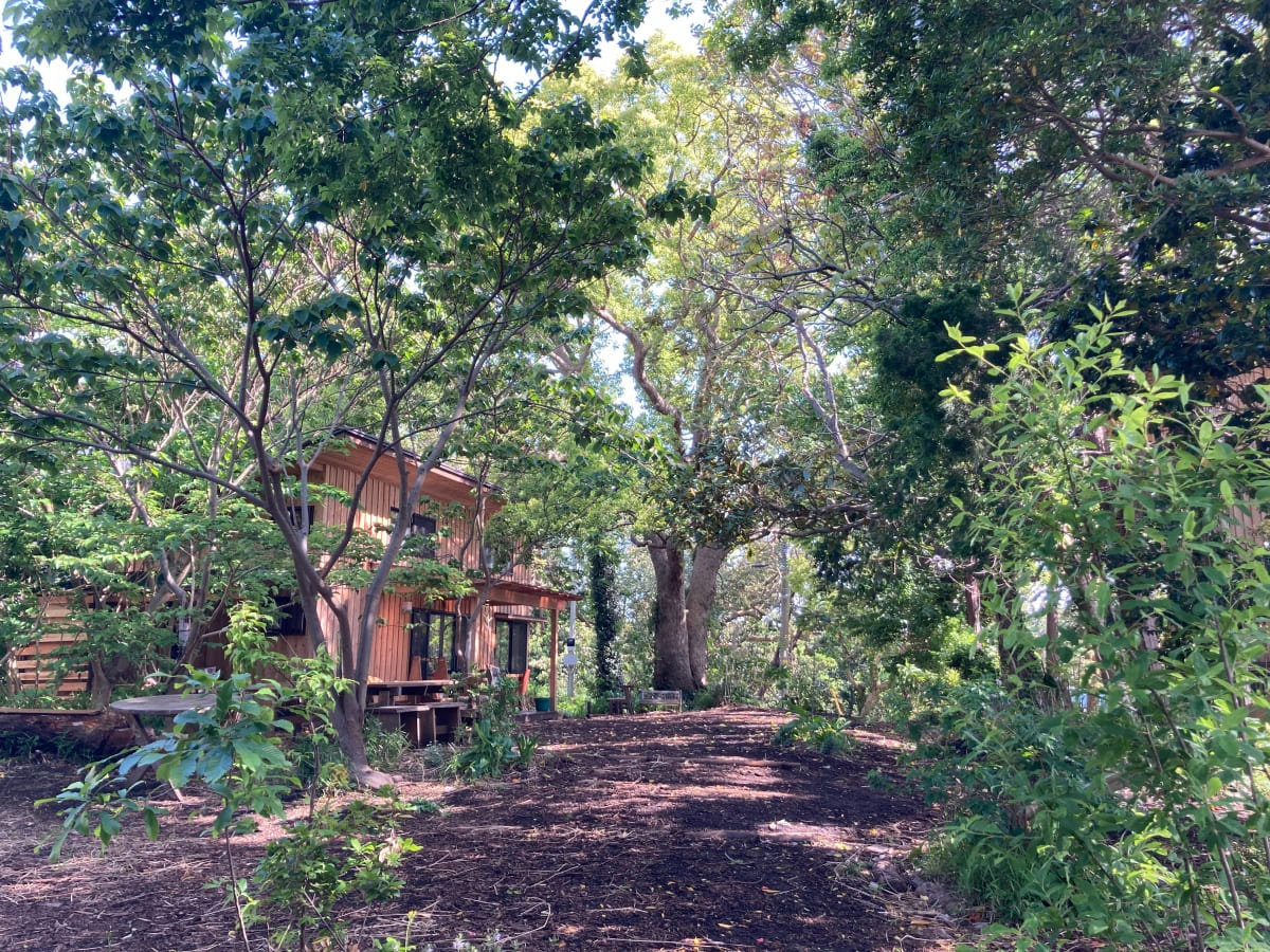 湘南秋谷の尾根、神社の上流に位置する土地にて、ファミリーホーム2棟と幼稚園の新築計画。既存の荒廃した家屋と樹木群を解体活用しながら、敷地内に加えて隣接した道と神社斜面地の環境再生の成果をヒントに、建物の分棟配置と土地利用を計画。建物はコンパクトかつシンプルな地杉の切妻屋根、内装はワークショップにより炭漆喰で仕上げた。現在は御神木のクスノキに見守られながら、施主と子ども達とともにメンテナンスを継続して育んでいる。