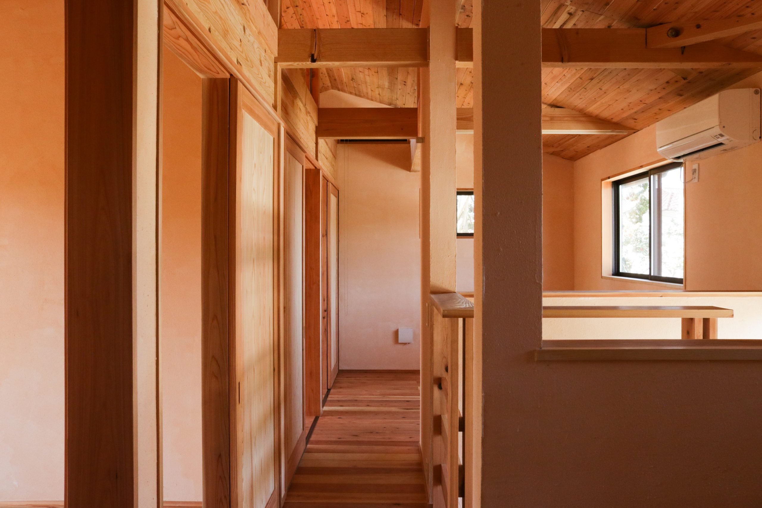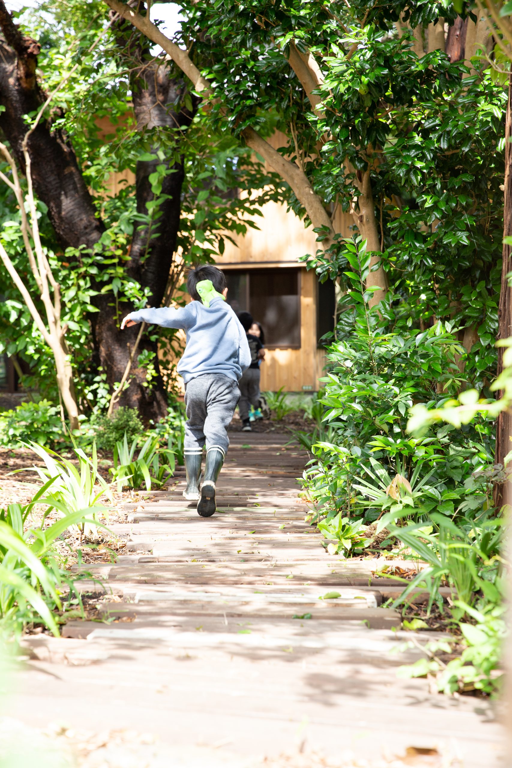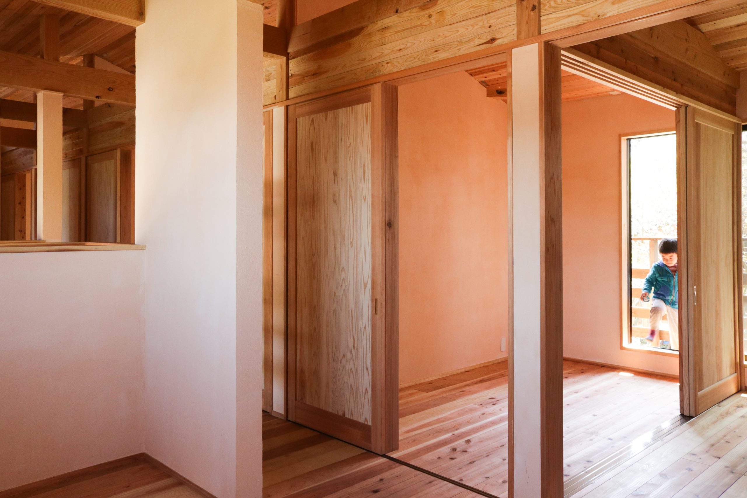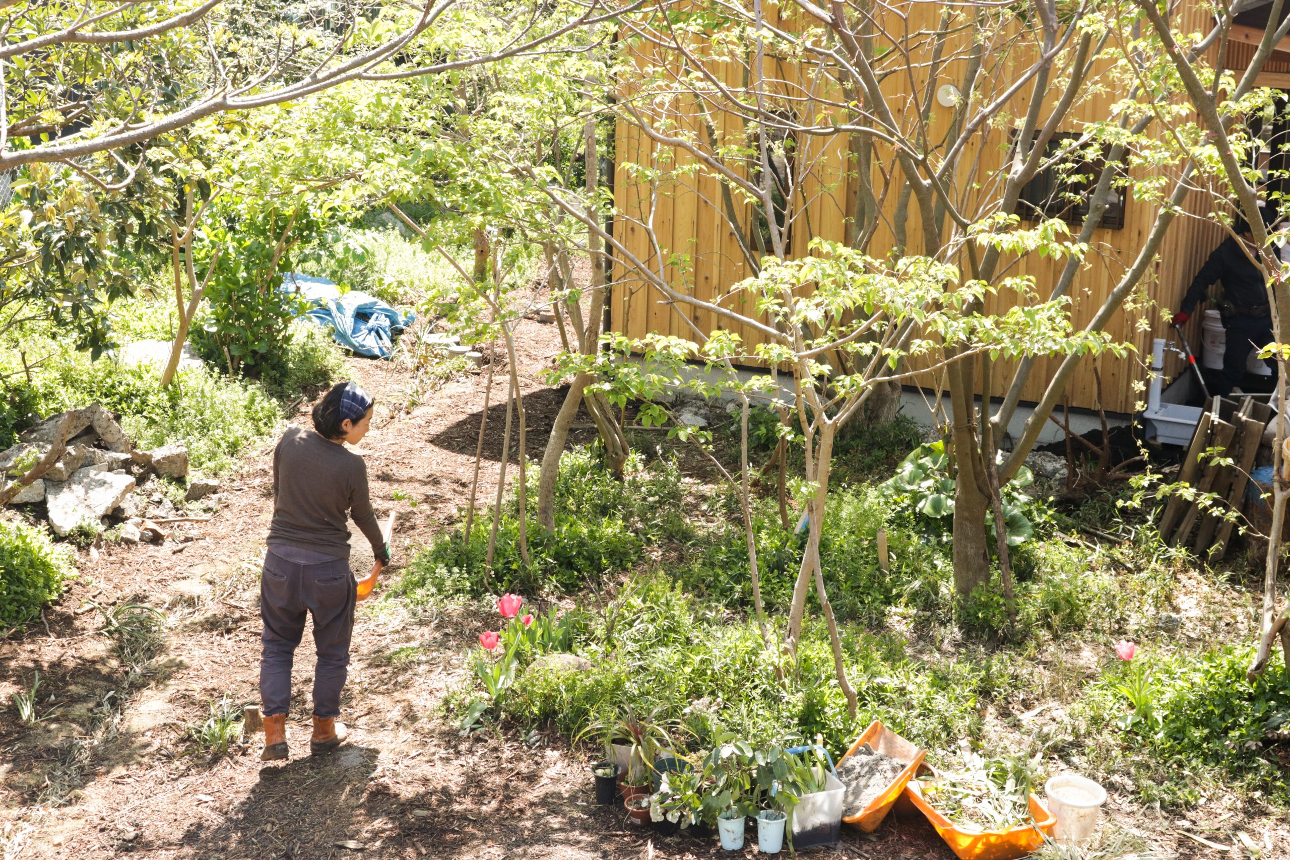 湘南秋谷の尾根、神社の上流に位置する土地にて、ファミリーホーム2棟と幼稚園の新築計画。既存の荒廃した家屋と樹木群を解体活用しながら、敷地内に加えて隣接した道と神社斜面地の環境再生の成果をヒントに、建物の分棟配置と土地利用を計画。建物はコンパクトかつシンプルな地杉の切妻屋根、内装はワークショップにより炭漆喰で仕上げた。現在は御神木のクスノキに見守られながら、施主と子ども達とともにメンテナンスを継続して育んでいる。