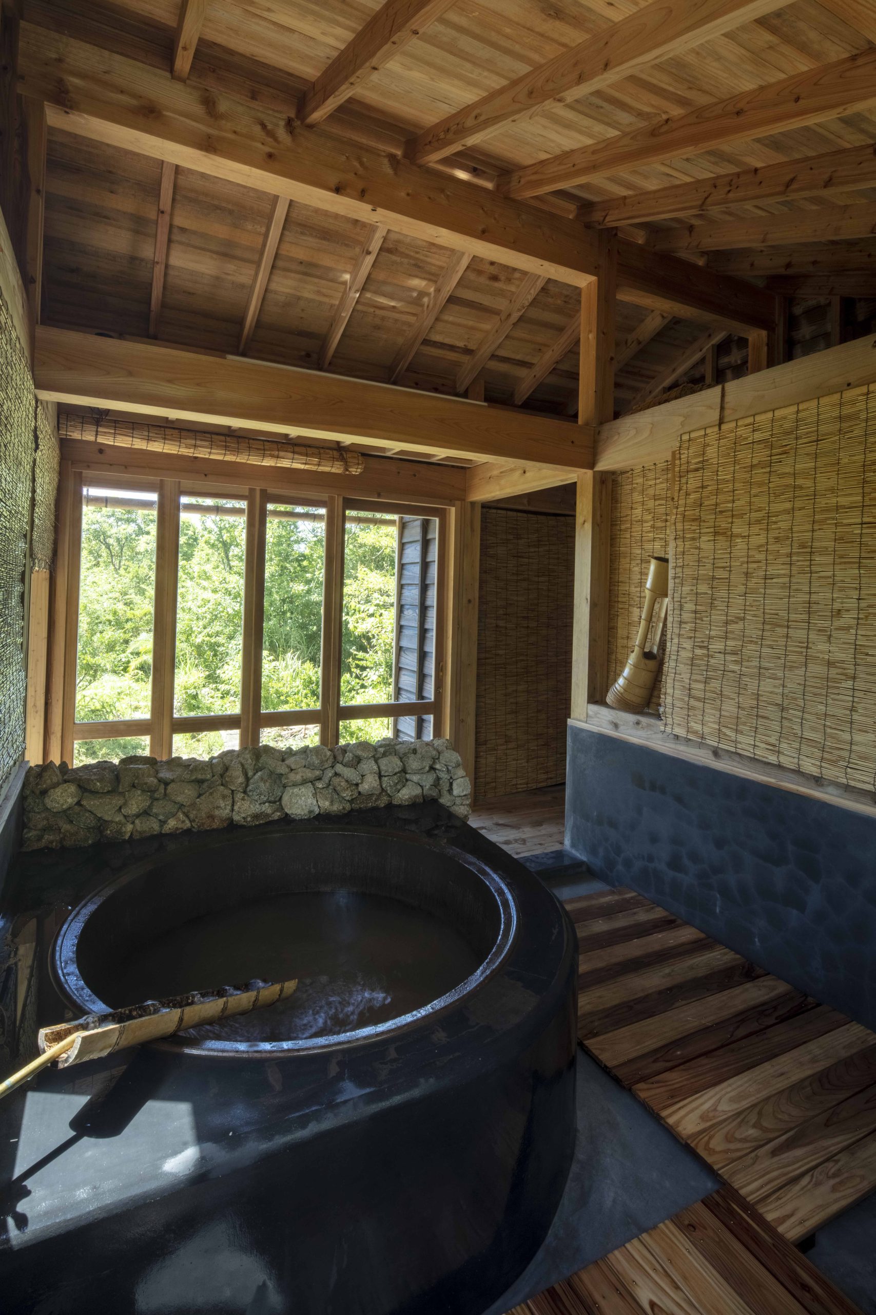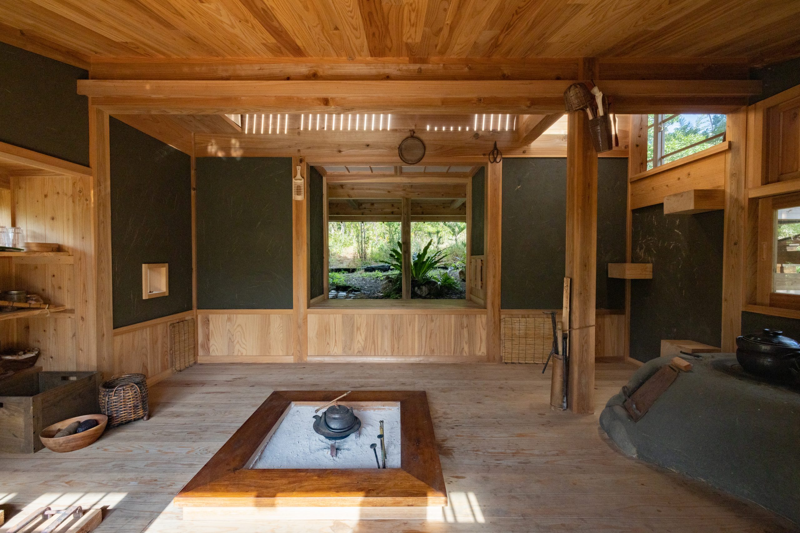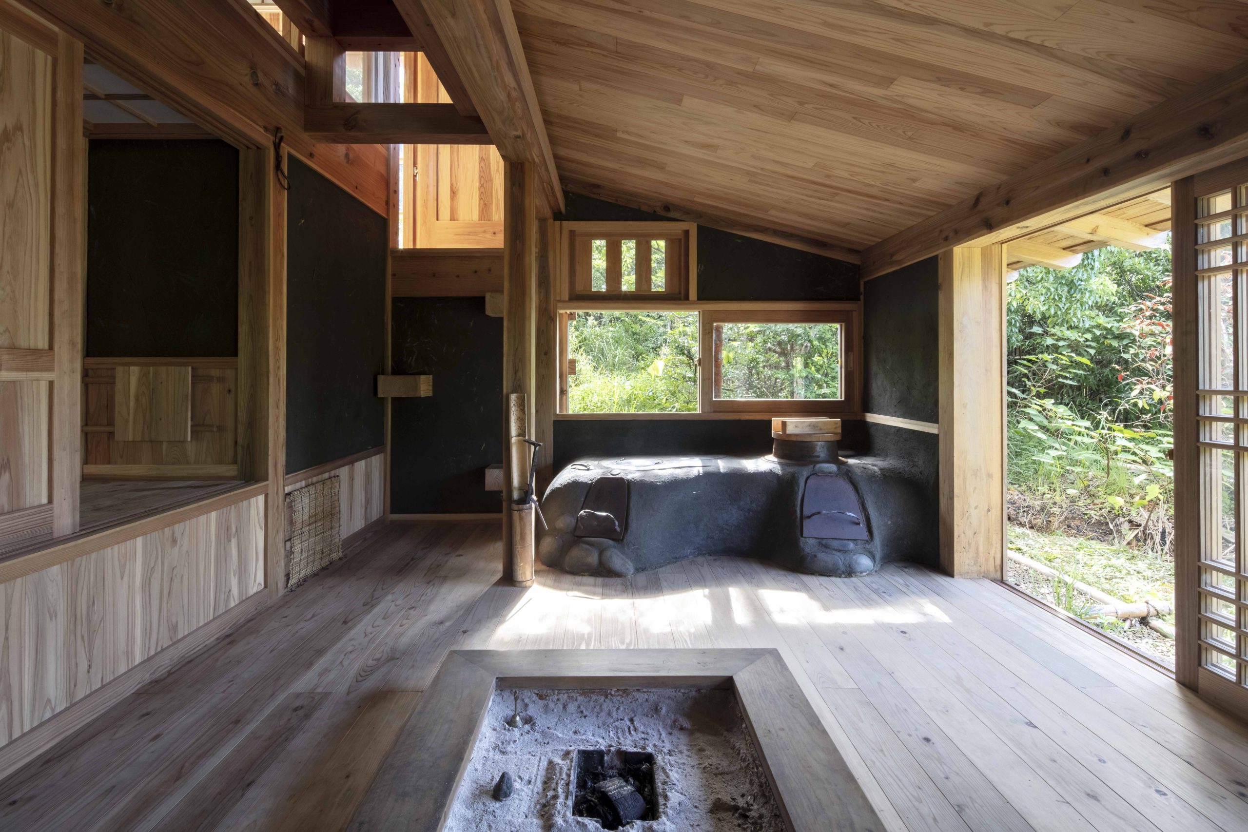 母屋は畳の広間を中心に、東西南北の庭に繋がる縁側空間と、1段下には岩盤層まで切土造成した炊事場を設けた。造成残土は敷地内に敷葉工法で活用した。水屋は五右衛門風呂を中心に、トイレと脱衣、干し場をコンパクトにまとめている。離れは本を読む書斎であり、瞑想の場として使われる場所であるとともに、来客時には炉で茶を沸かすおもてなしの場となり、来客が宿泊する宿ともなる。
