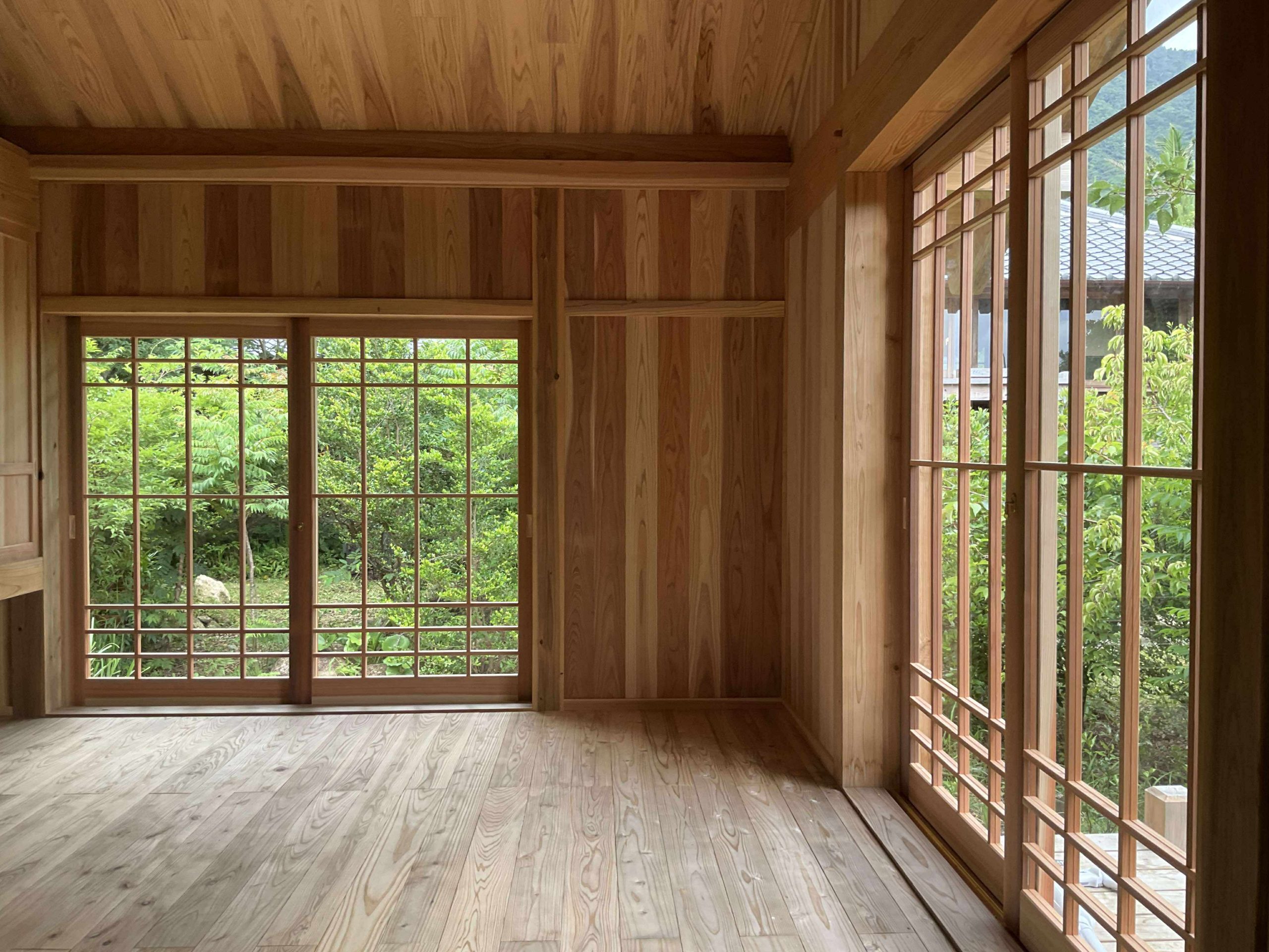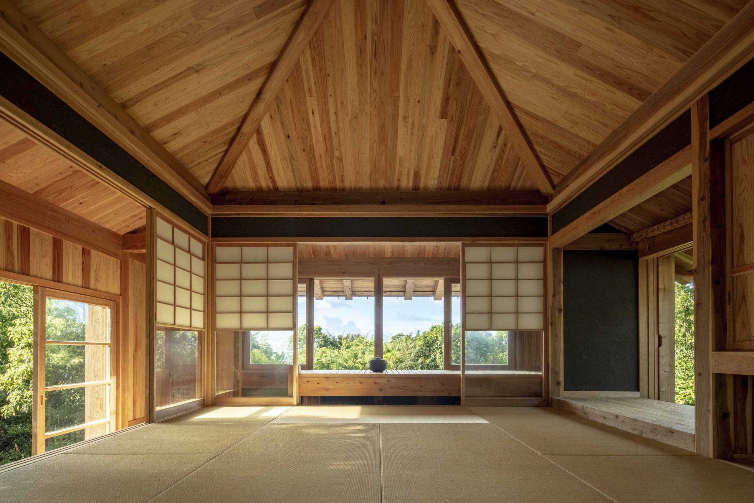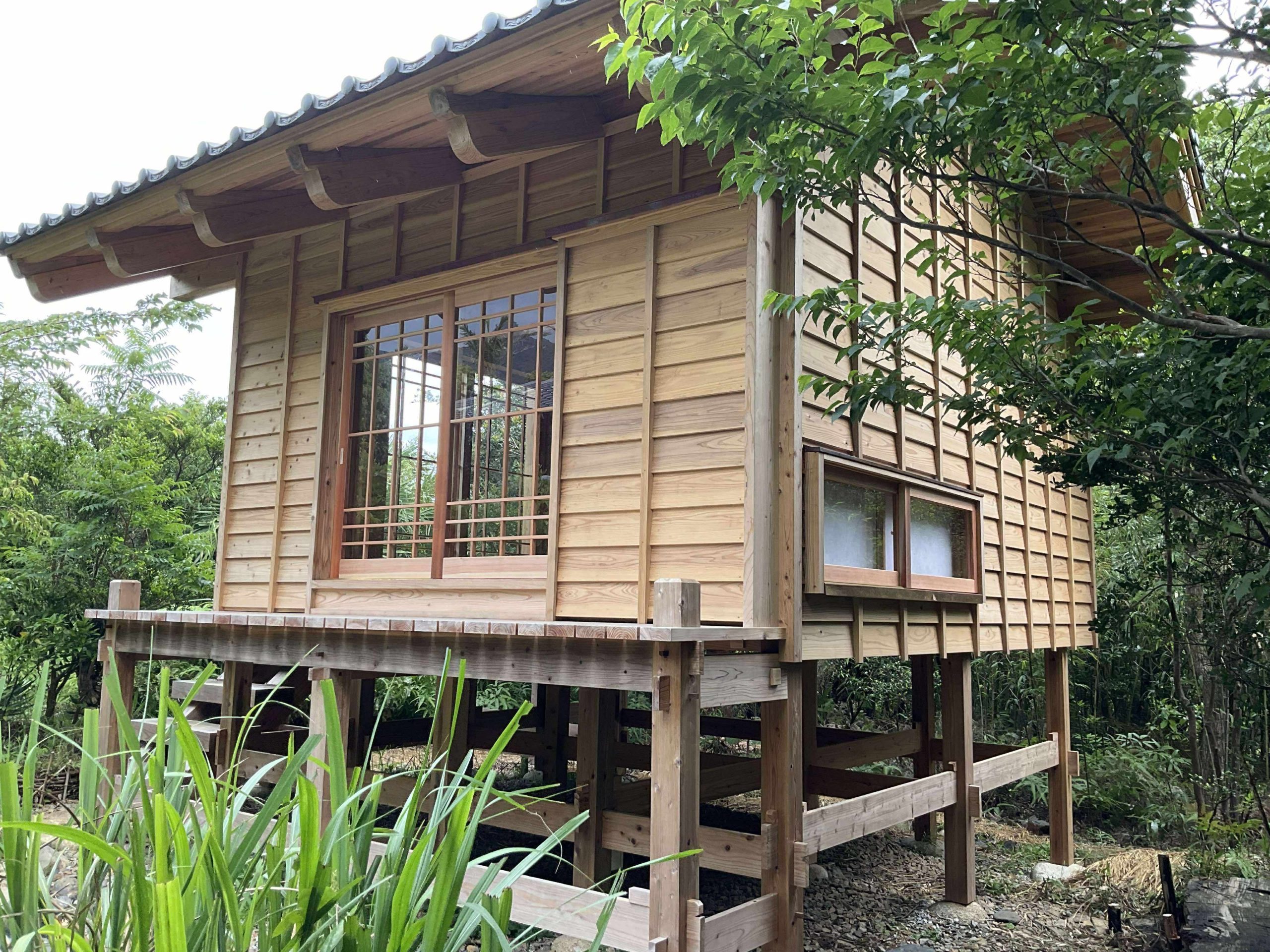 母屋は畳の広間を中心に、東西南北の庭に繋がる縁側空間と、1段下には岩盤層まで切土造成した炊事場を設けた。造成残土は敷地内に敷葉工法で活用した。水屋は五右衛門風呂を中心に、トイレと脱衣、干し場をコンパクトにまとめている。離れは本を読む書斎であり、瞑想の場として使われる場所であるとともに、来客時には炉で茶を沸かすおもてなしの場となり、来客が宿泊する宿ともなる。