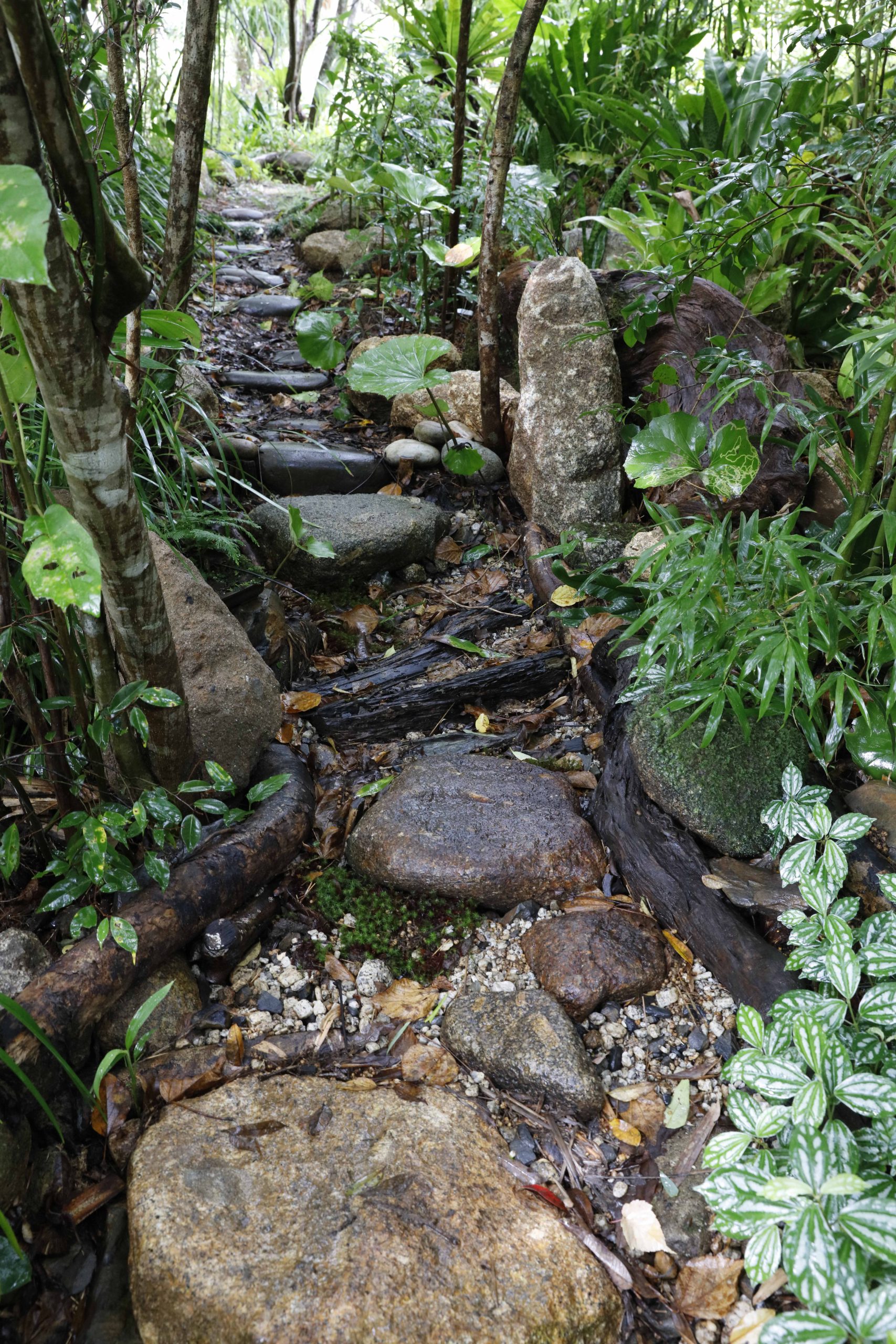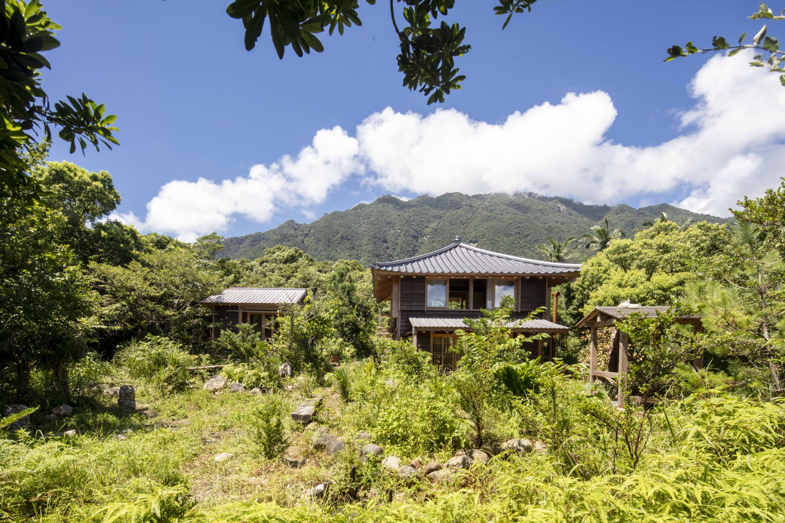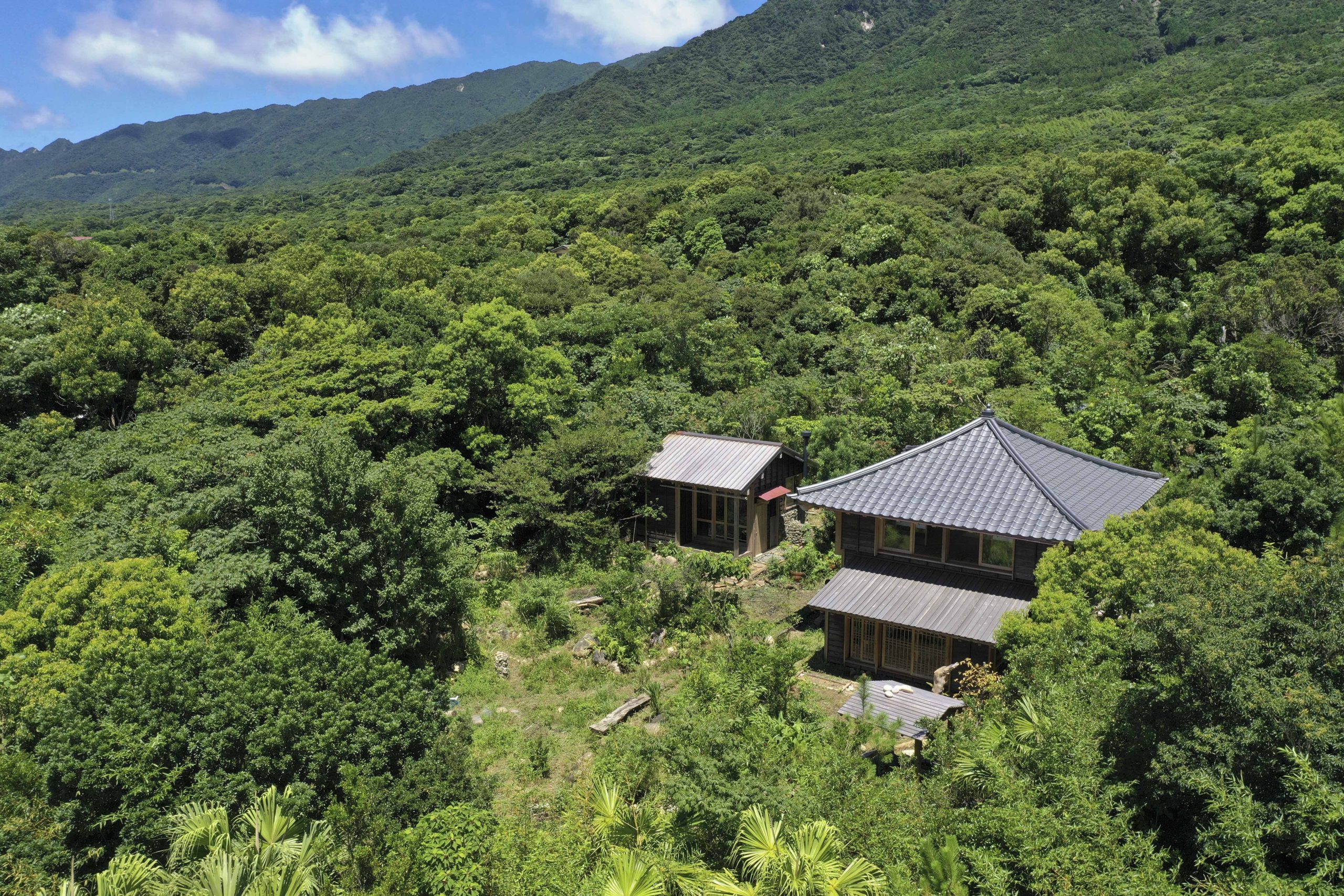 建主は、屋久島の豊かな自然と植生に惹かれてインドから移住した。敷地は、亜熱帯気候の植生に囲まれており、緩やかな南向きの斜面地であるため、1年を通じて温暖で、川沿いの照葉樹林帯が夏の西日と冬の西風を緩和してくれている。一方、シダなどの蒸散機能の高い植物が薮化し、粘土質土壌も相まって水が停滞しやすい土中環境になっていた。風と水の流れを読む地上部の風通し、試掘による土壌観察を基に設計を始め、敷地中央の樹木群を残しながら、母屋・水屋・離れの分棟配置を計画した。