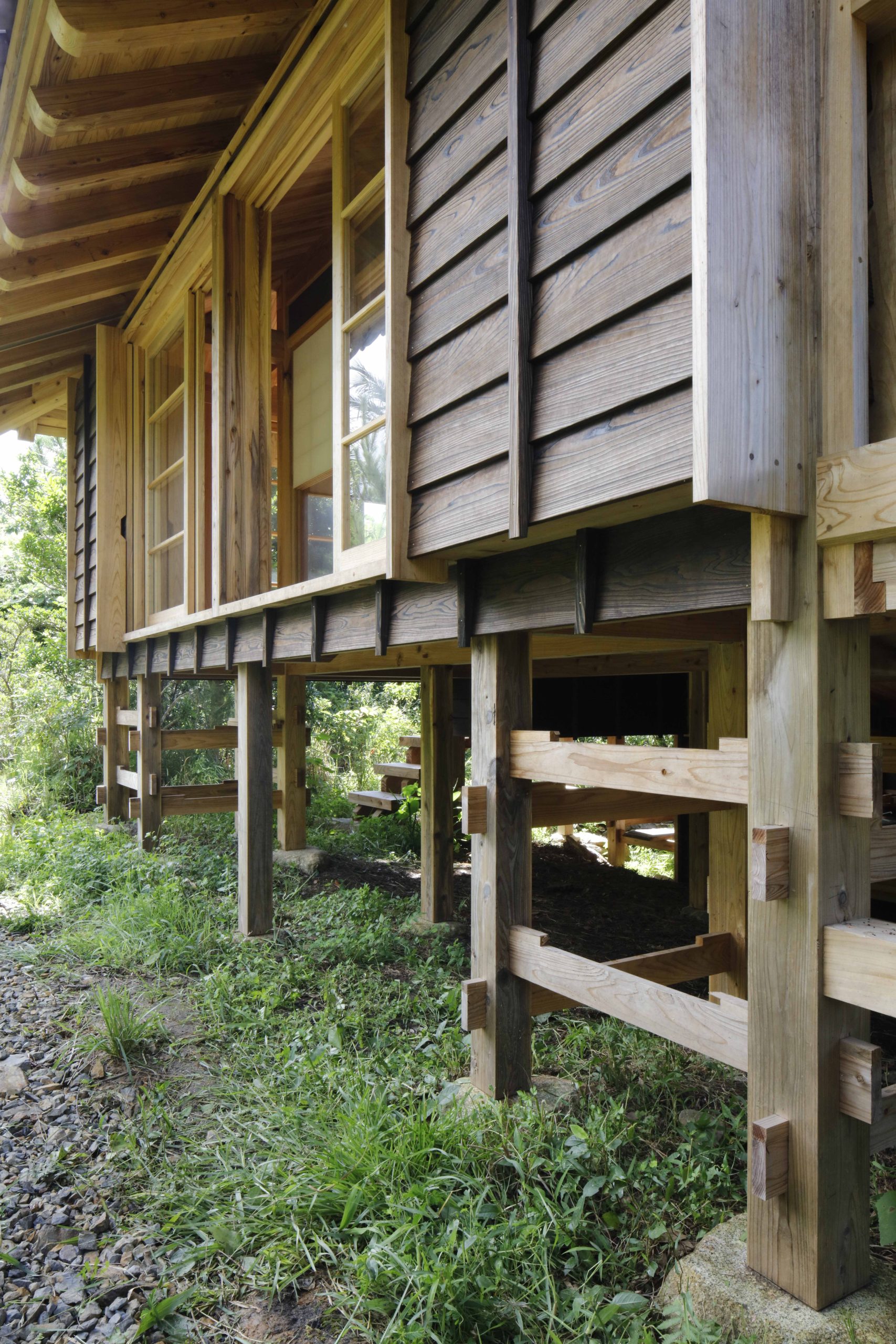 屋根からの雨落ち部、石場建て基礎の下地、配管配線の引き込みルート、人と工事の動線空間を中心に、土中の空気と水の循環、通気浸透機能を再生することも試みた。石場建て基礎は草が育つ開放された大地を担保すると共に、木組みと貫の構造体からの均等分散的な振動エネルギーを土中に伝えることによって、土中の発酵環境を育む。こういった計画に加え、建築工事の前から工事完了までケアし続けることで、現場には穏やかな風が流れて、植物も水の浸透を担ってくれる。設計の調整や変更もその場の風と土の状態をヒントに決定した。