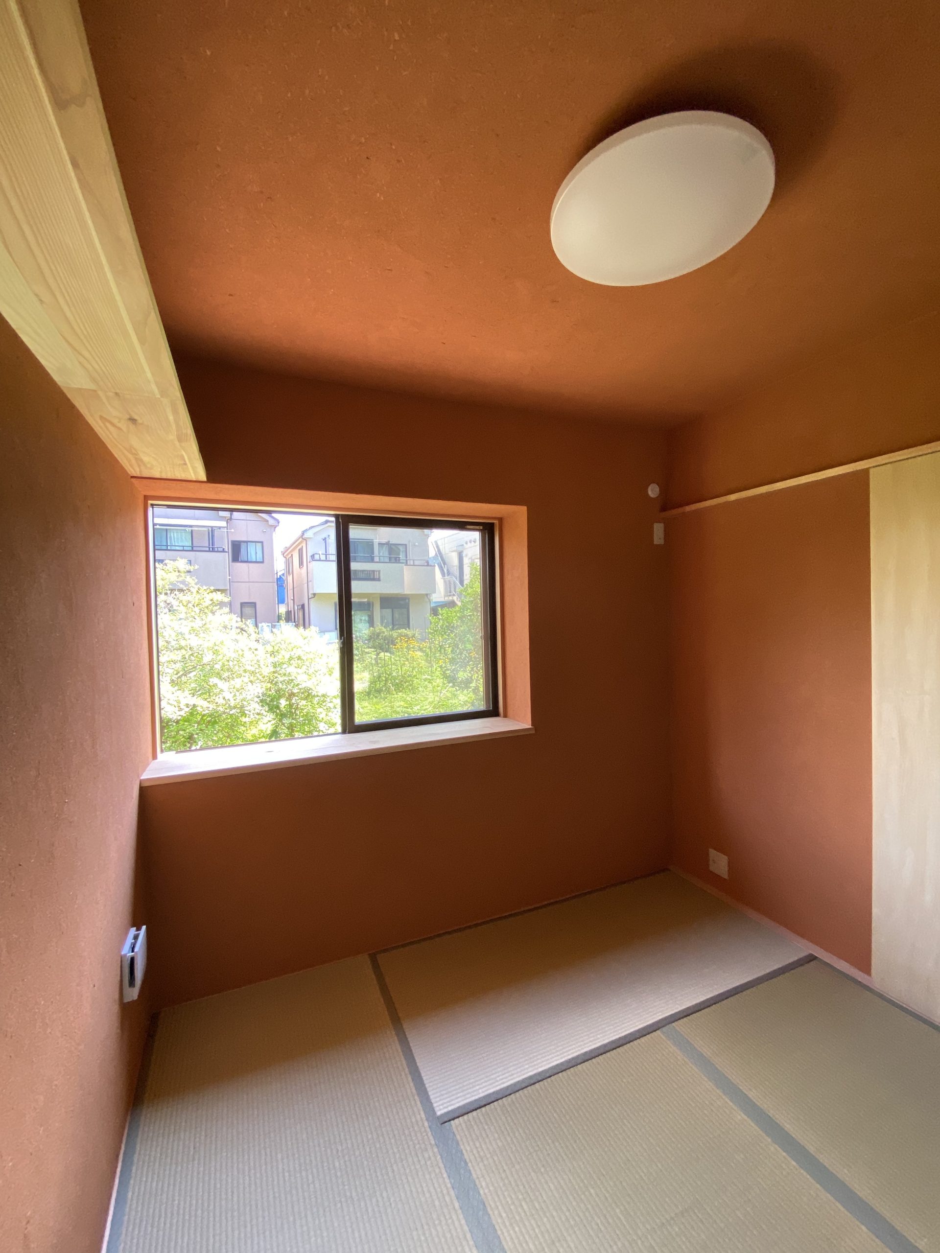 体を休める寝室は、暗めの土壁と畳で洞窟のような落ち着いた雰囲気をつくり、対照的に活動の場となるキッチンやリビング・ダイニングは、白い漆喰壁と地杉のフローリングで明るく優しい空間となるよう計画しました。
