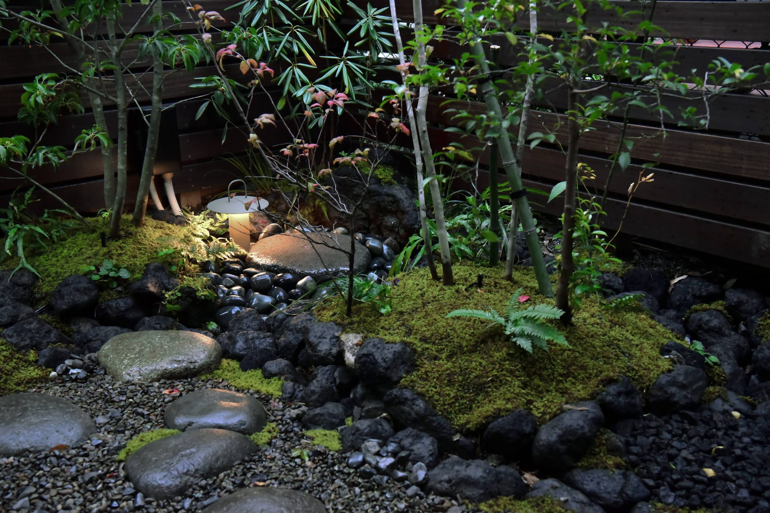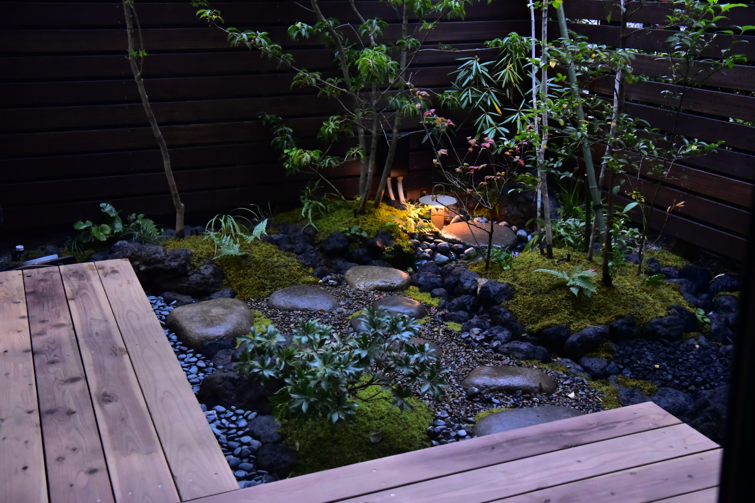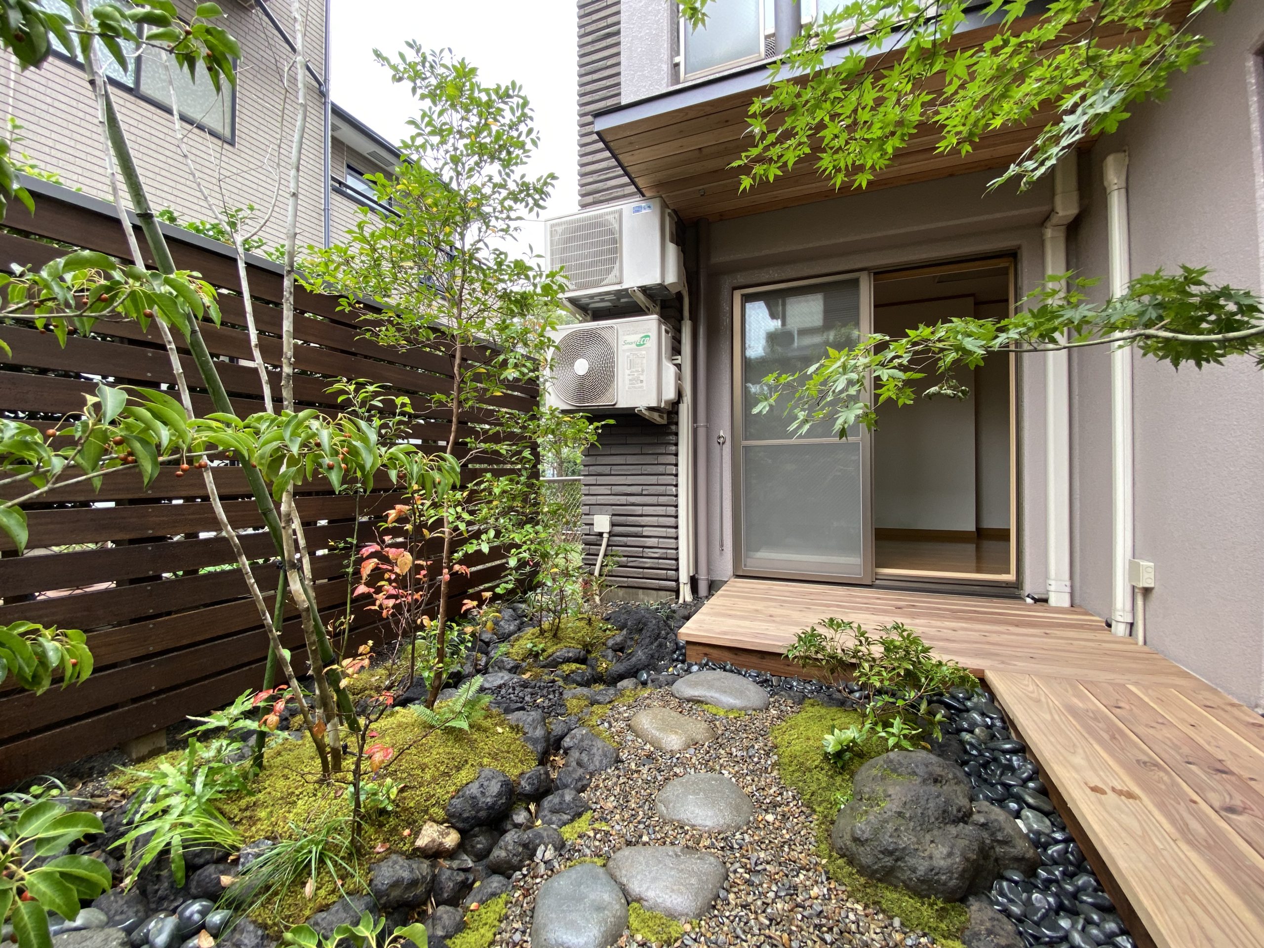 「庭を見ながら心静かにヨガに取り組みたい」というご要望から、四季の移ろいを感じる和の設えの庭を作りました。