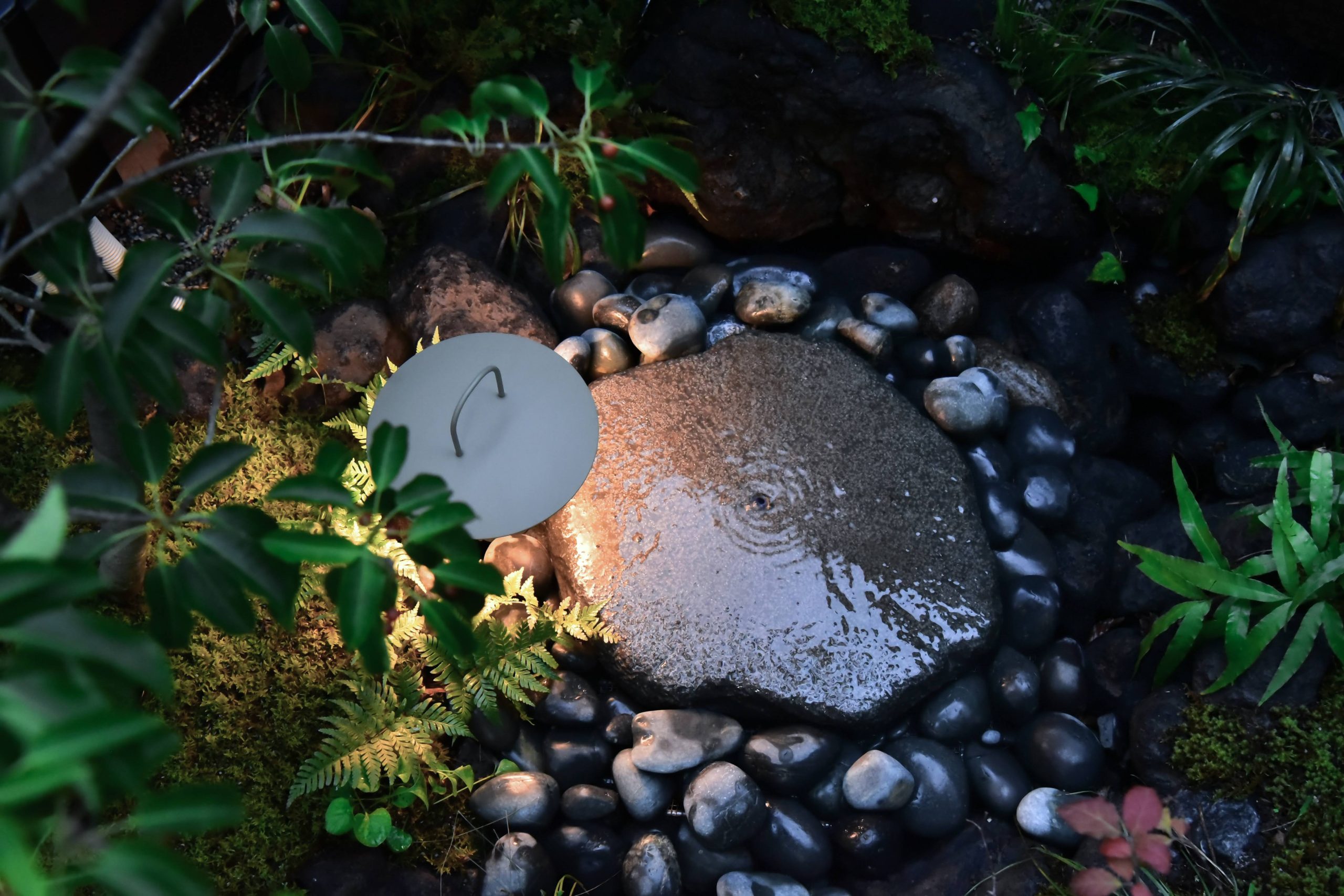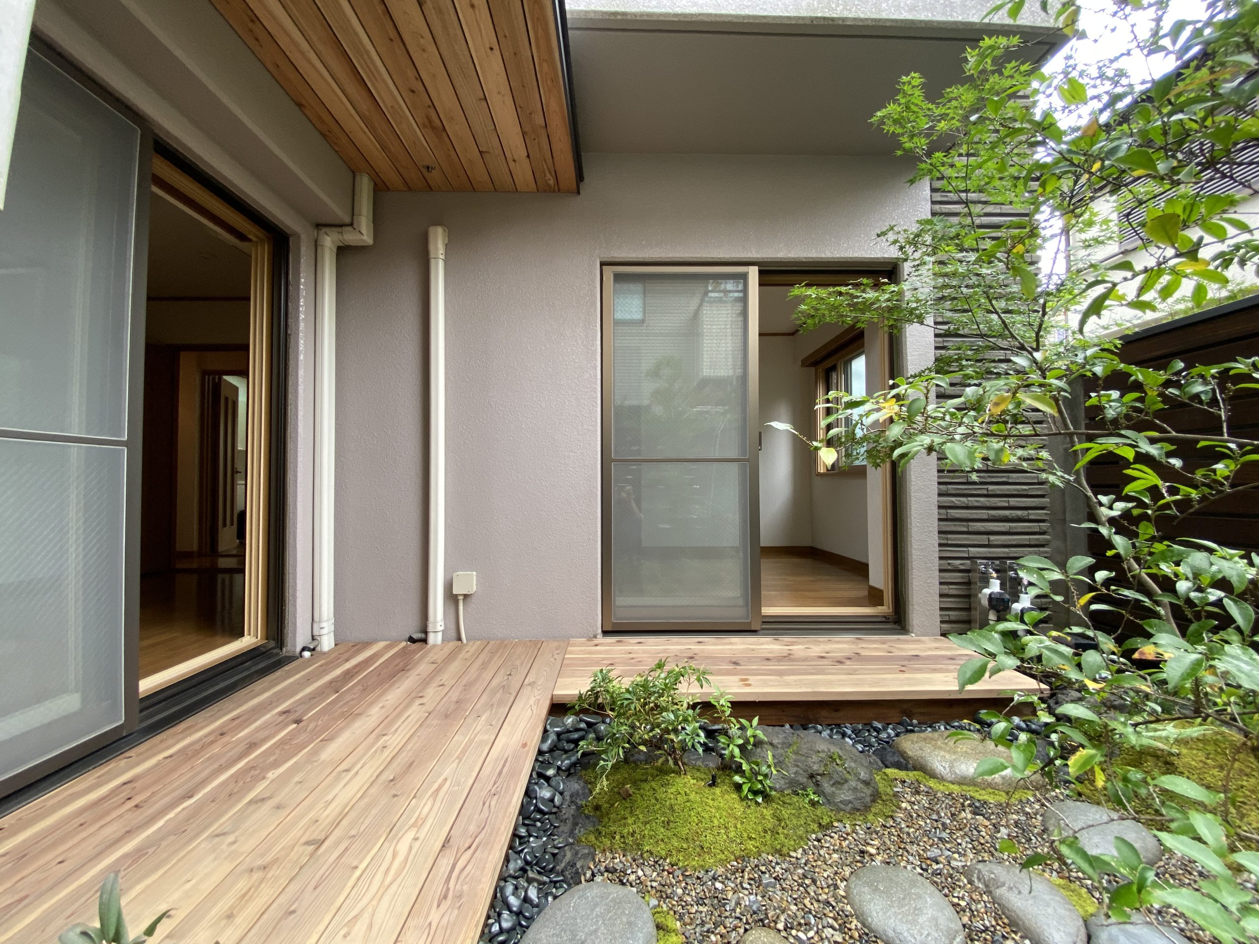 部屋と庭をつなぐ縁側デッキでは、水盤から滴る水の音、そよそよと風で揺れる植栽の様子、苔の匂いなどが五感で感じられ、心穏やかな時間が流れます。