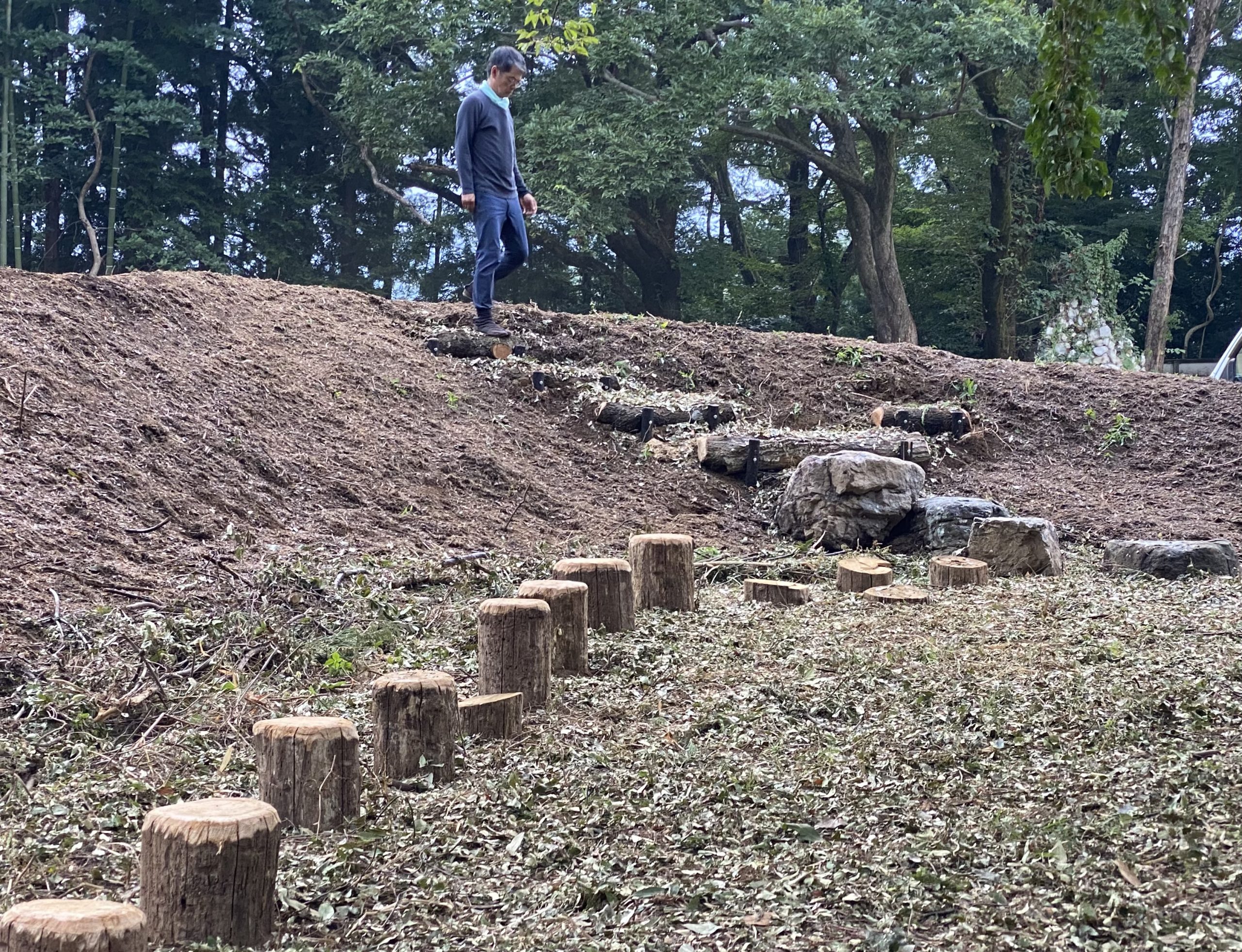 誰もが巡り、散策し、休み、遊べる動線を確保しながら、樹木や植物の根が育つ土中環境を段階的に整えている。
