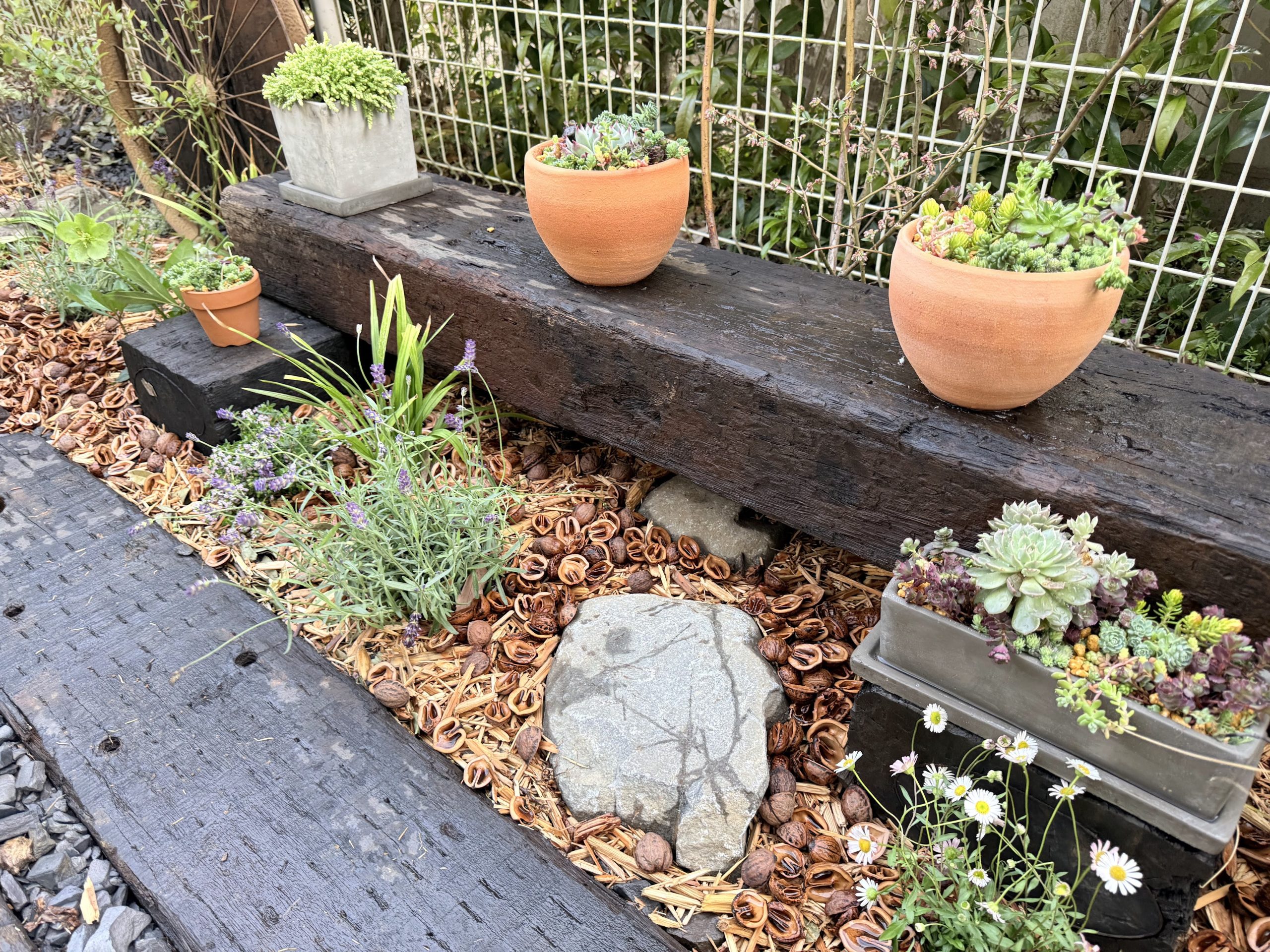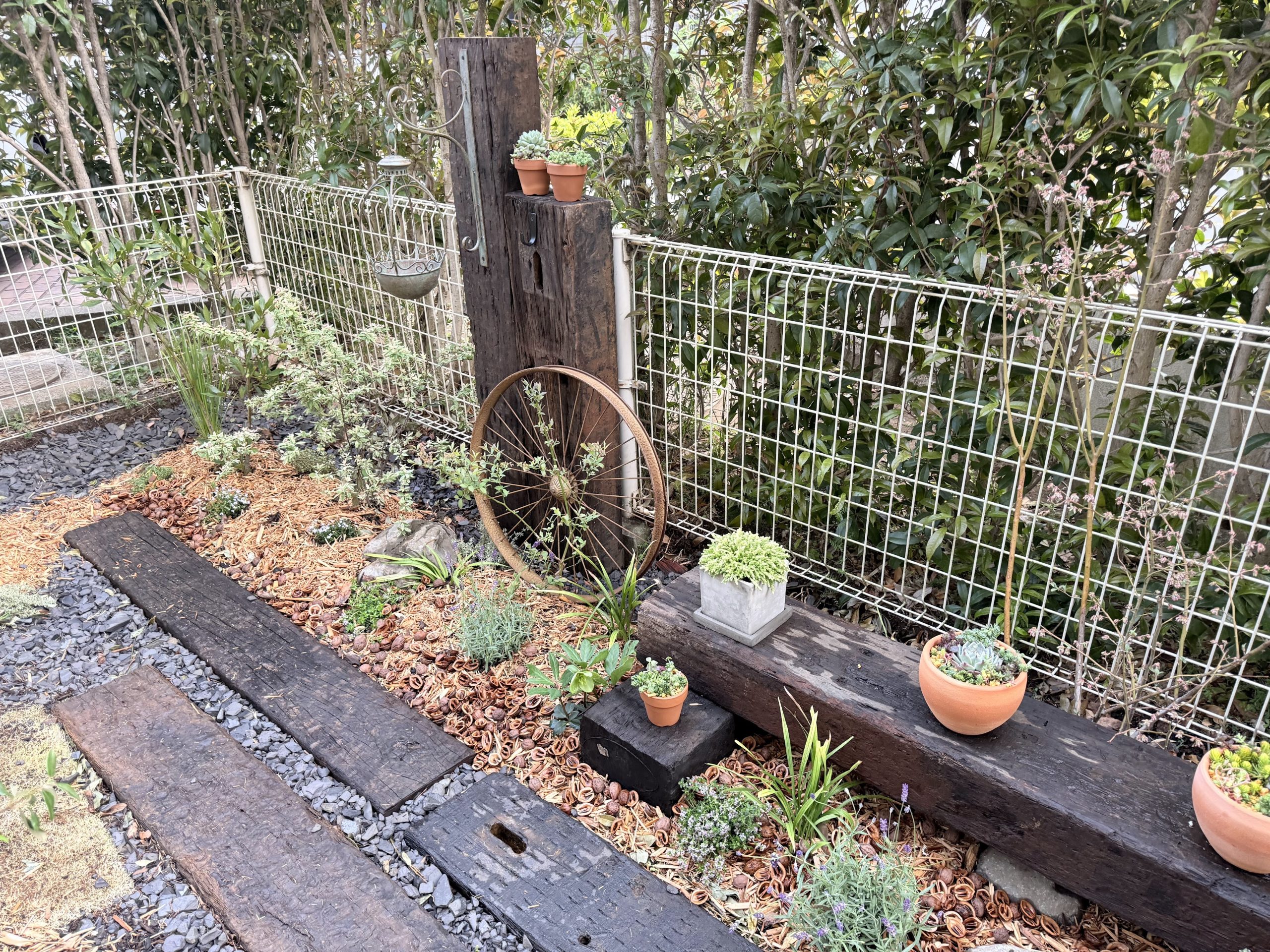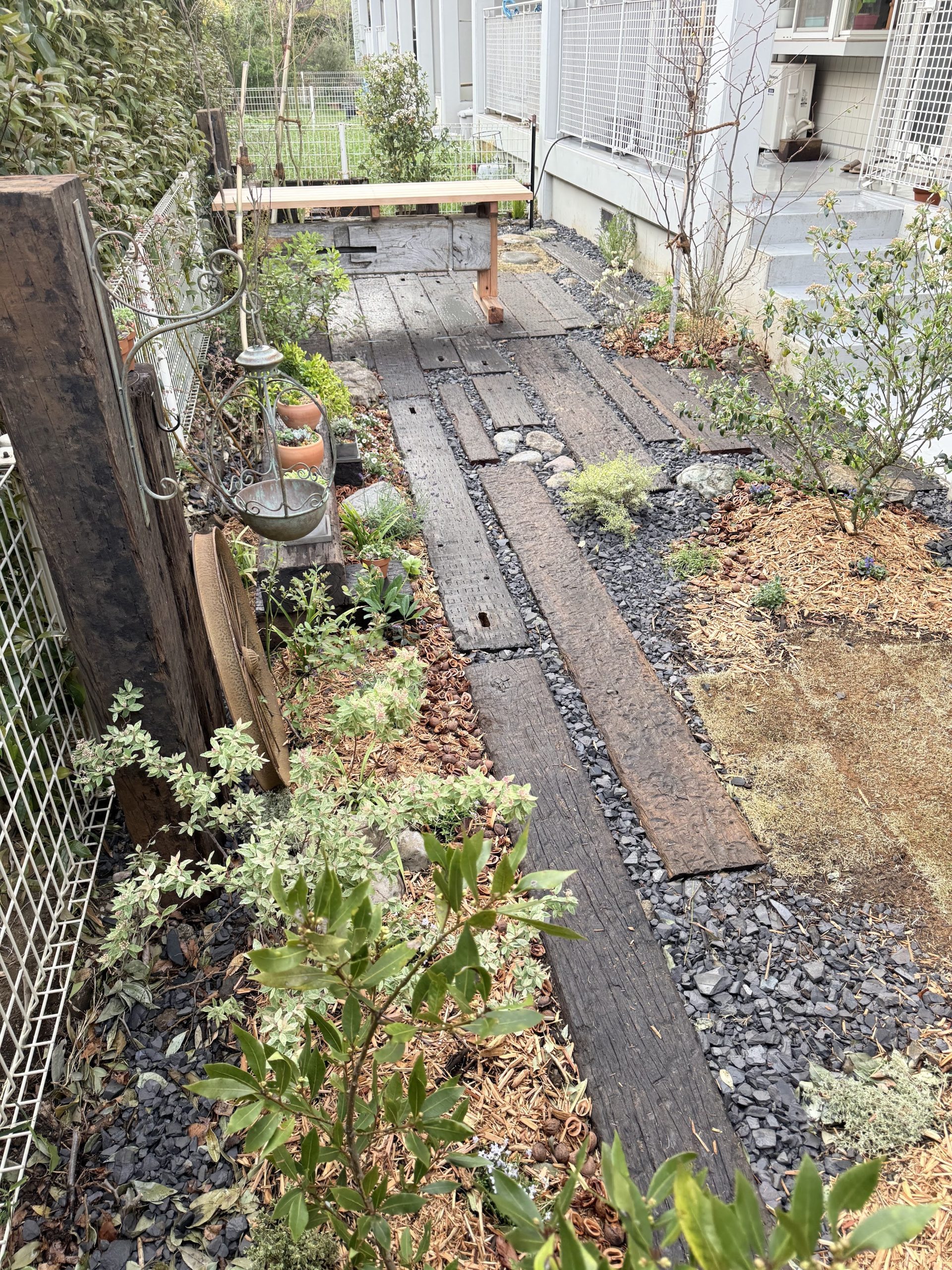 舗装には枕木や瓦チップなどの再生素材を用い、歩行性と管理のしやすさに配慮した。