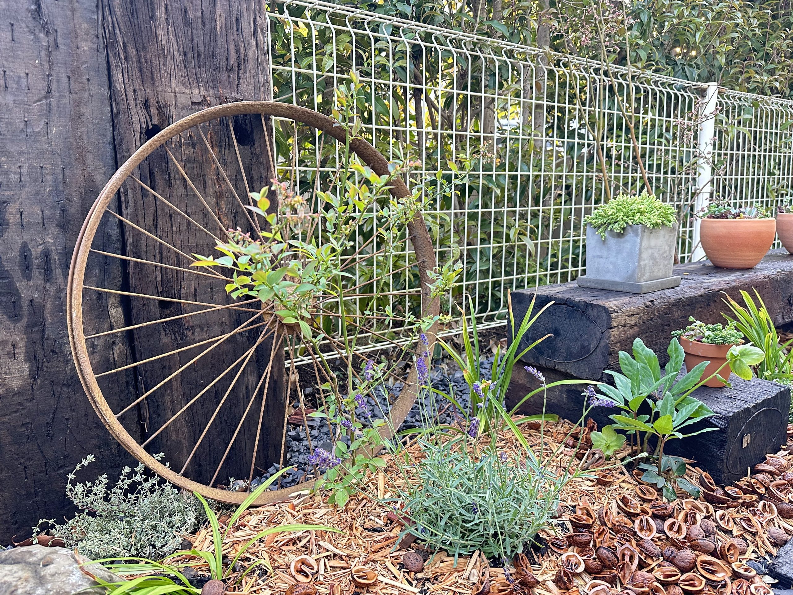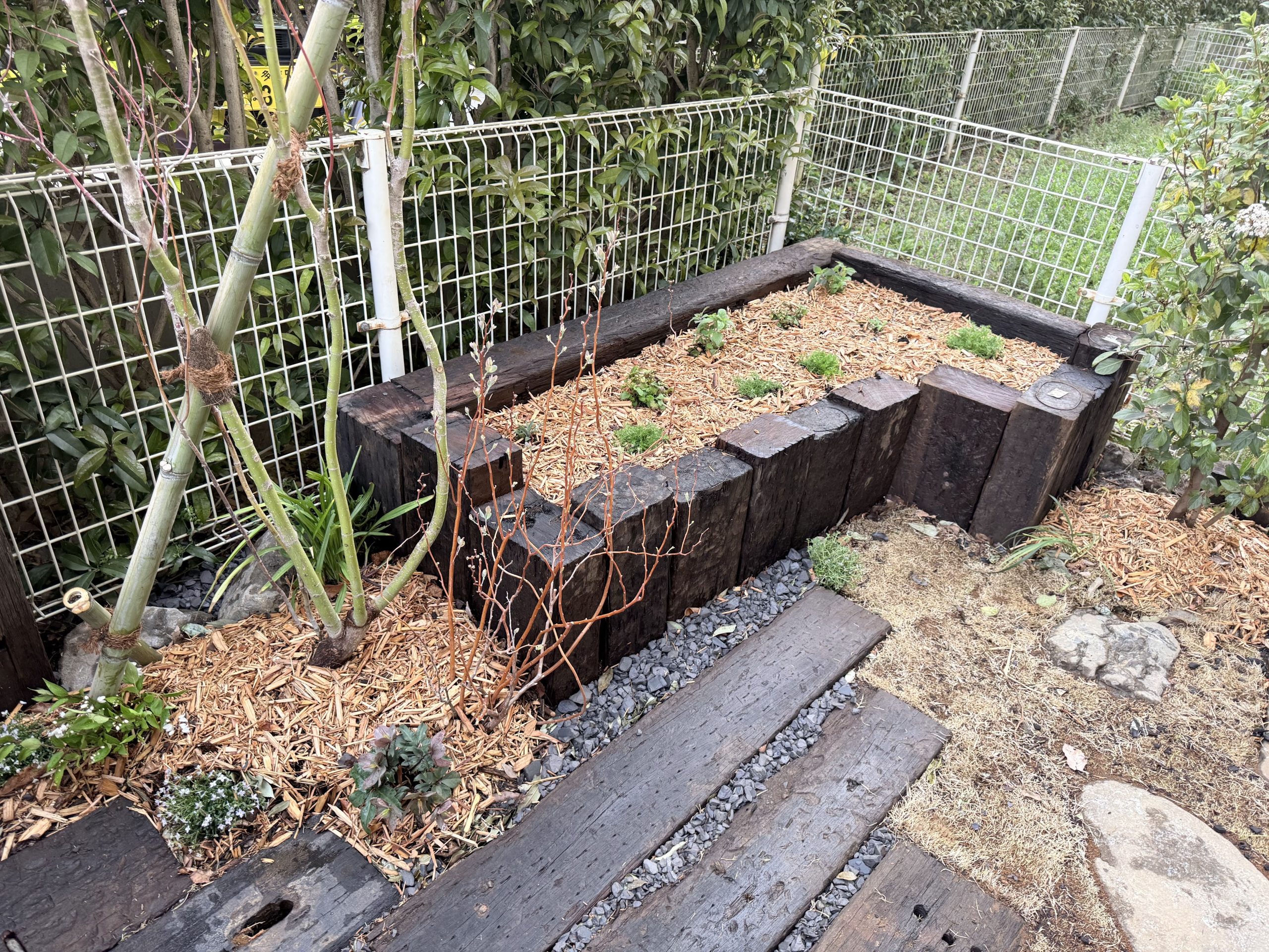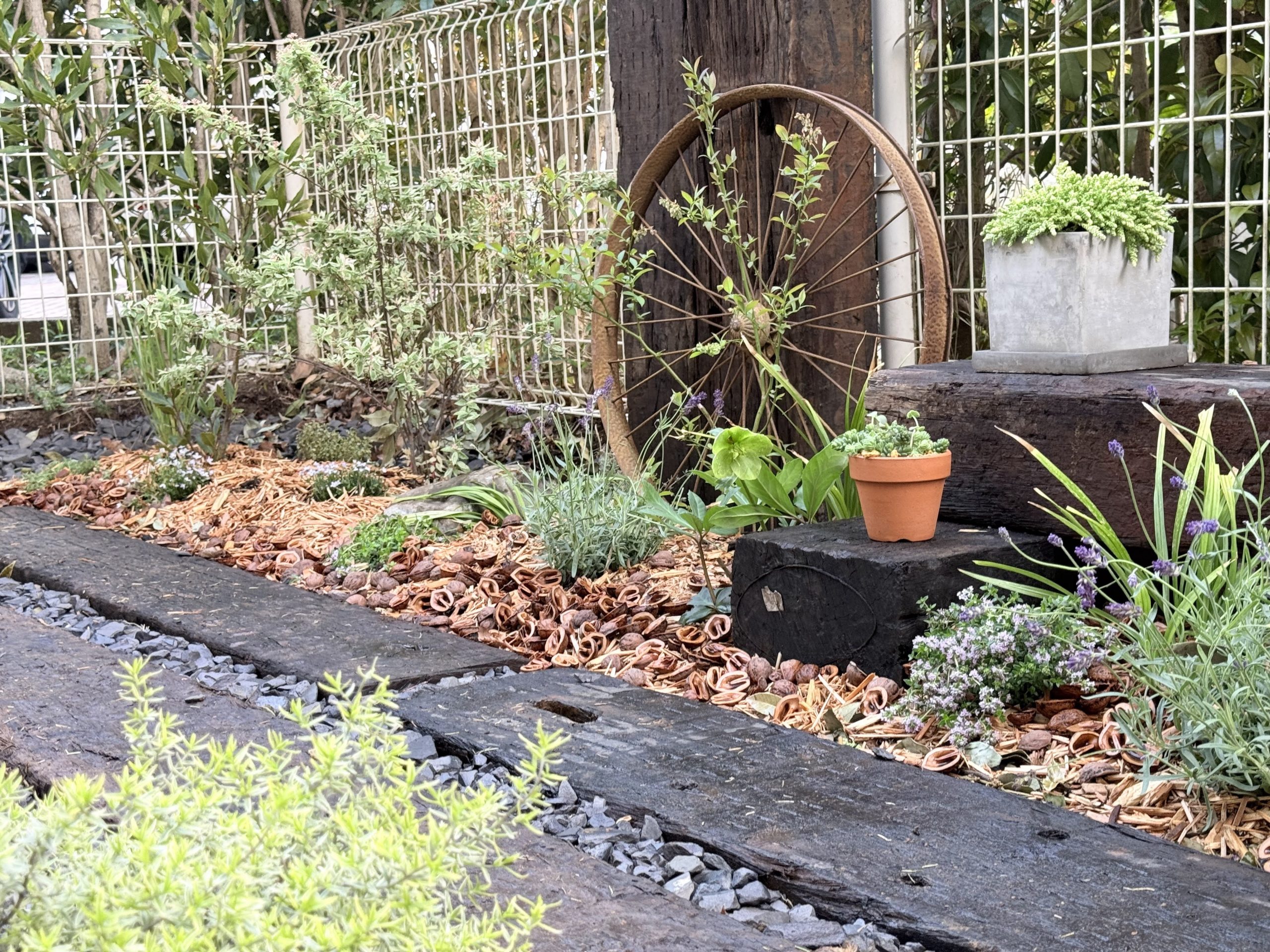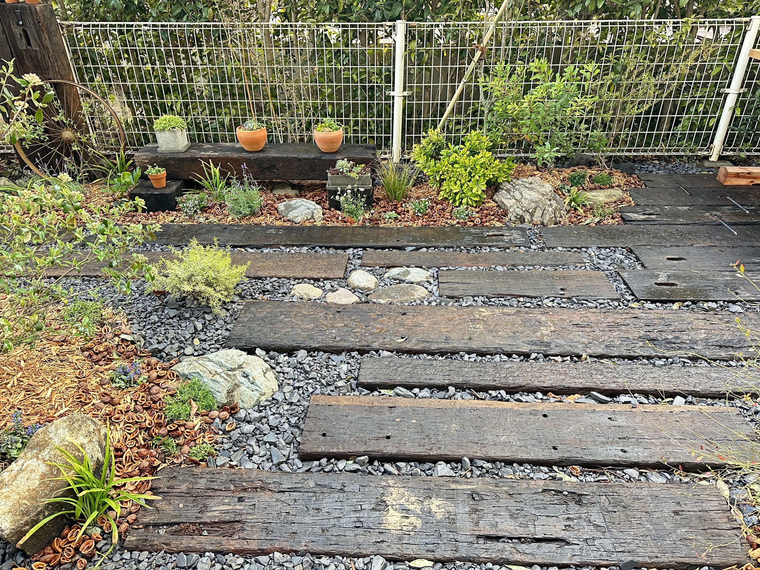 舗装には枕木や瓦チップなどの再生素材を用い、歩行性と管理のしやすさに配慮した。