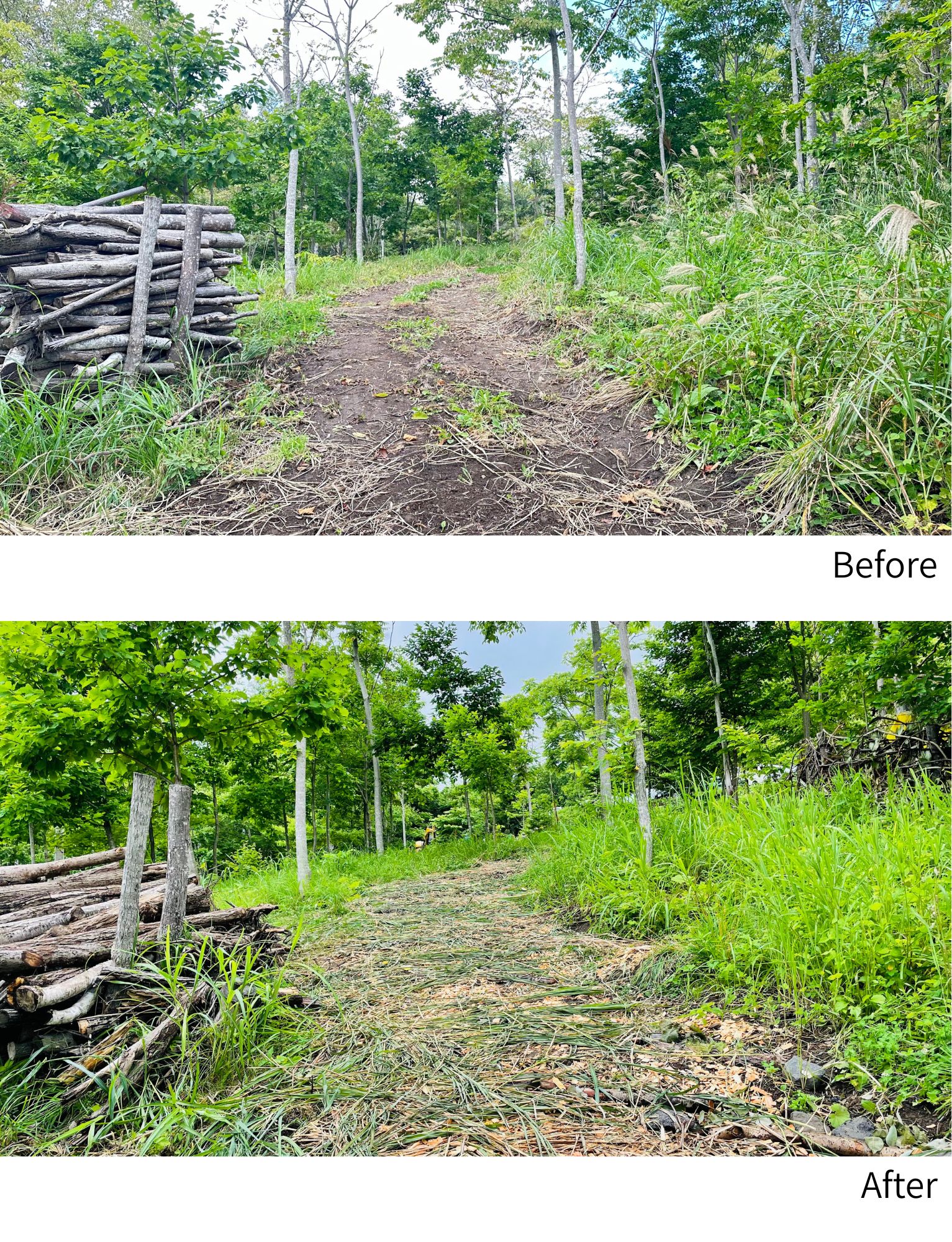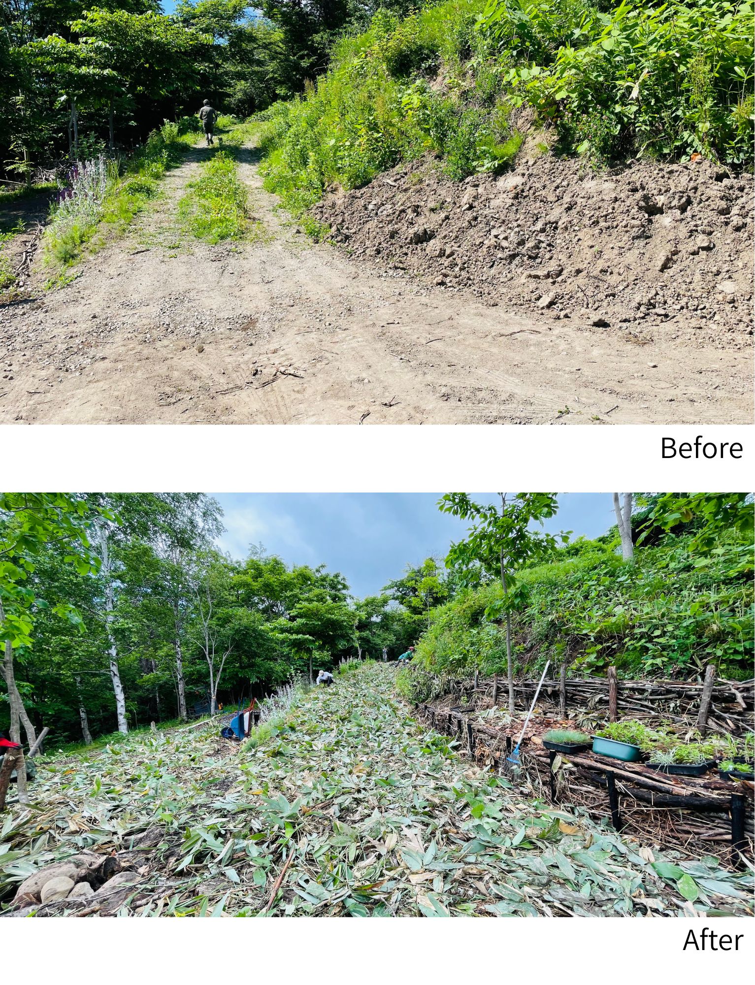 あわせて、丸太・グリ石・有機物など敷地内外の素材を活用し、斜面の土留めや路盤、スロープの安定化を図った。