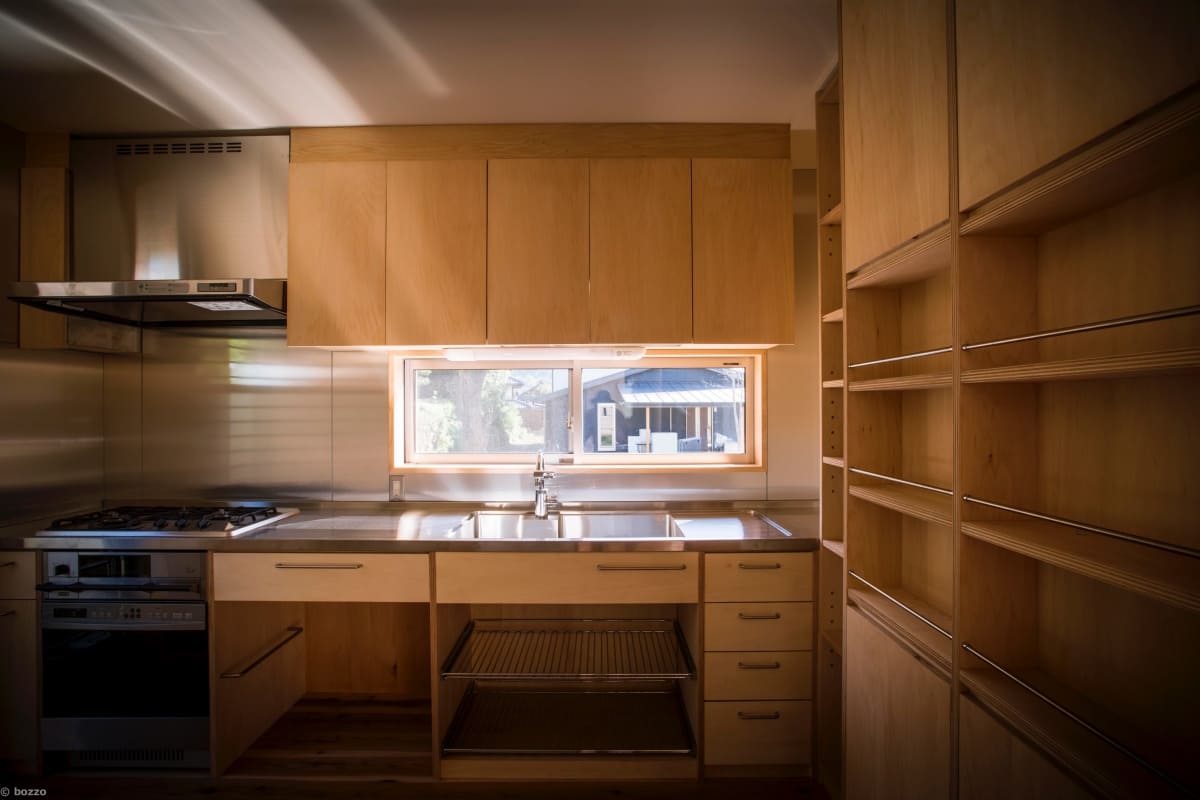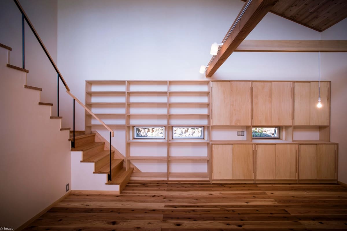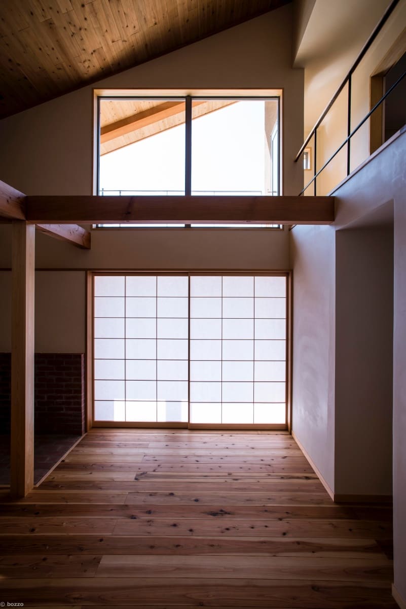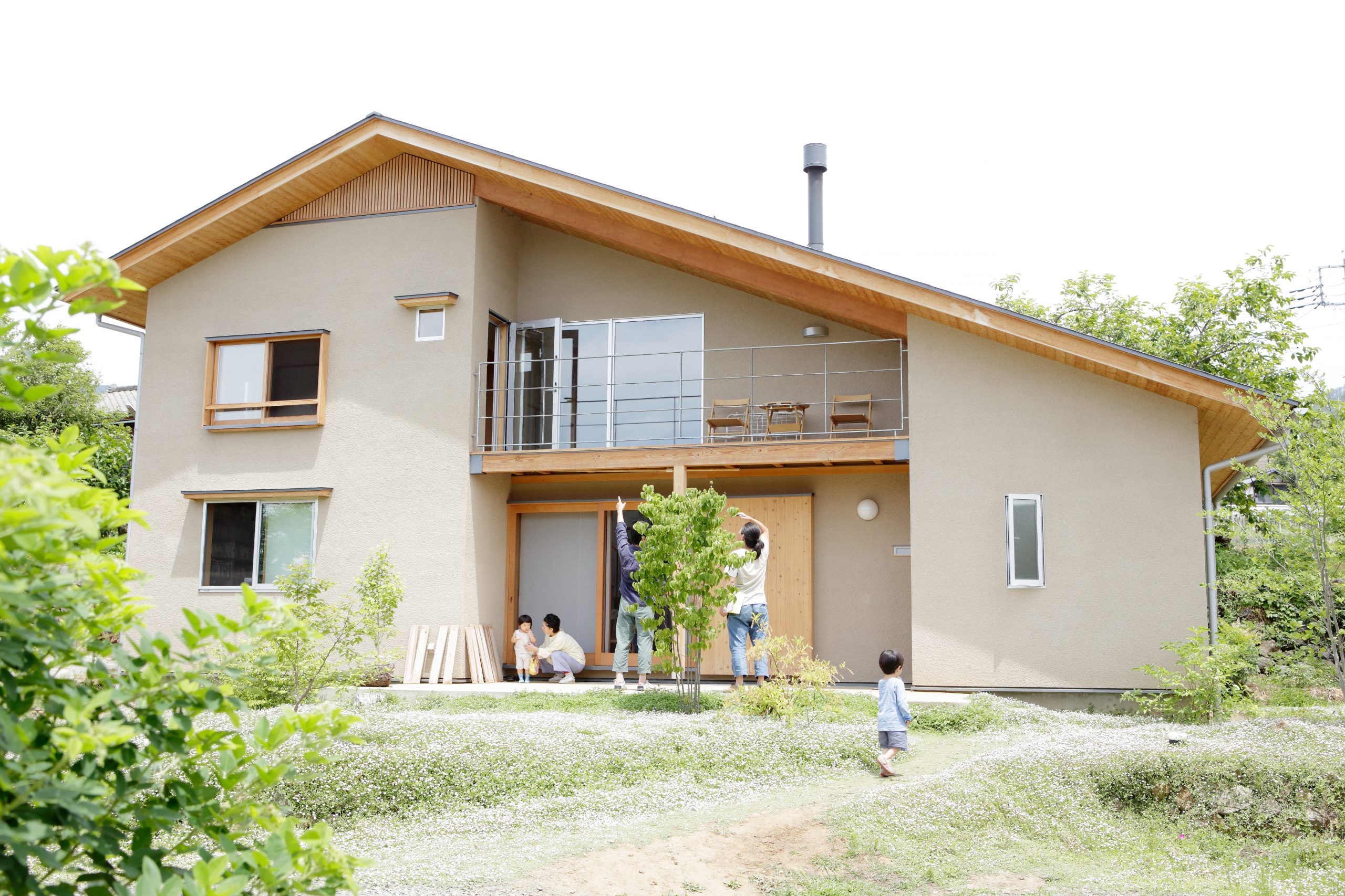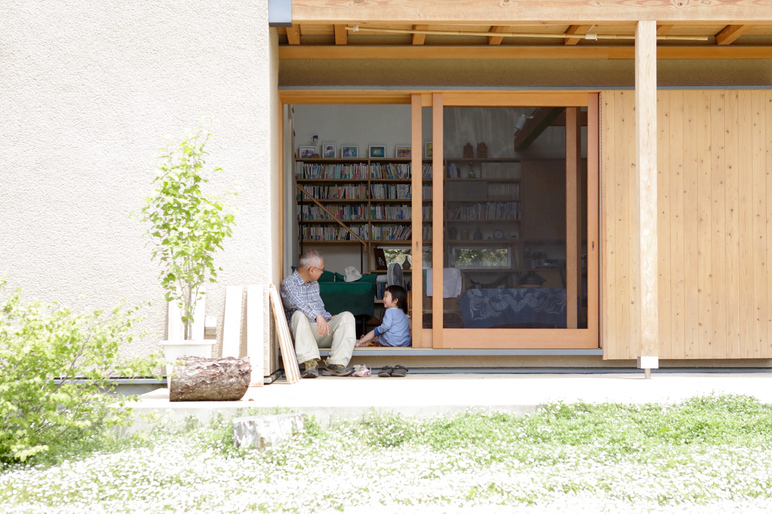 山梨県山梨市、緩やかで水はけの良い南斜面に計画した老夫婦の住まい。切妻の深い軒と植栽によって、夏の日射を遮りながら冬の日射を取り入れる。南側の庭と畑と繋がる土間と板間リビングを中心に、吹き抜けを介して眺望の良い畳の寝室を配置している。